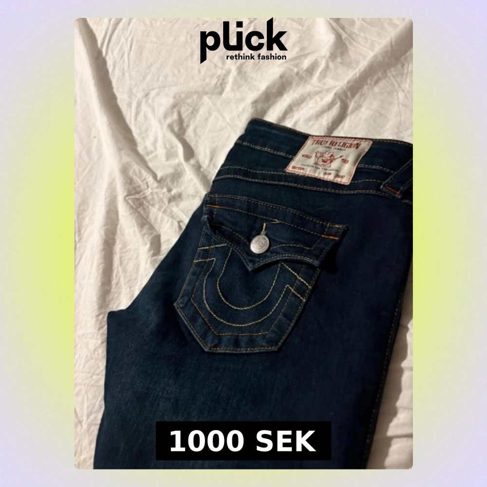 Säljer ett par mörkblå True Religion Joey jeans med låg midja och flare-ben. Klassiska kontrastsömmar, stora fickor med lock och silverfärgade knappar med logga. Ikonisk True Religion patch baktill. Perfekt för dig som gillar statement-jeans med coola detaljer.