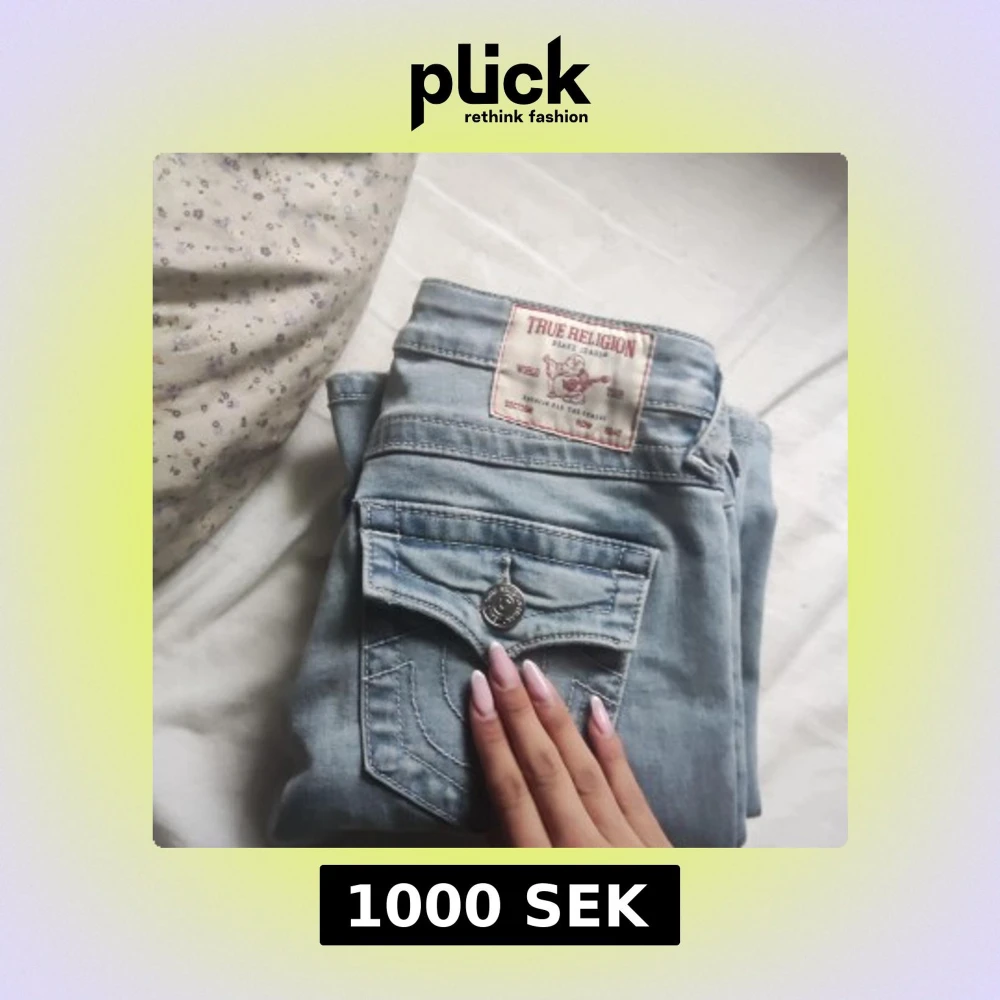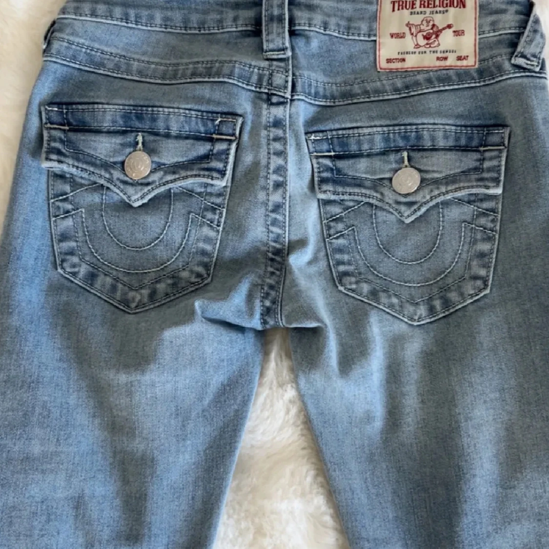 Säljer ett par ljusblå True Religion Joey jeans med låg midja och flare-ben. Storlek 23💕