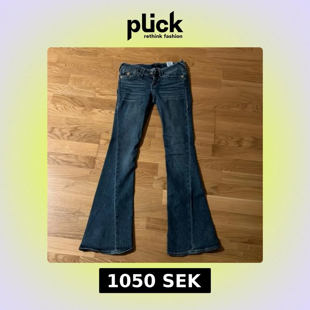 Snygga blå jeans från True Religion, modell Joey Low Rise Flare. De har låg midja, utsvängda ben och klassiska kontrastsömmar. Har ett litet slitage längst ner ett av benen då de är lite för långa för mig, men inget man tänker på. Annars är det i helt nyskick och använd bara ett fåtal gånger.