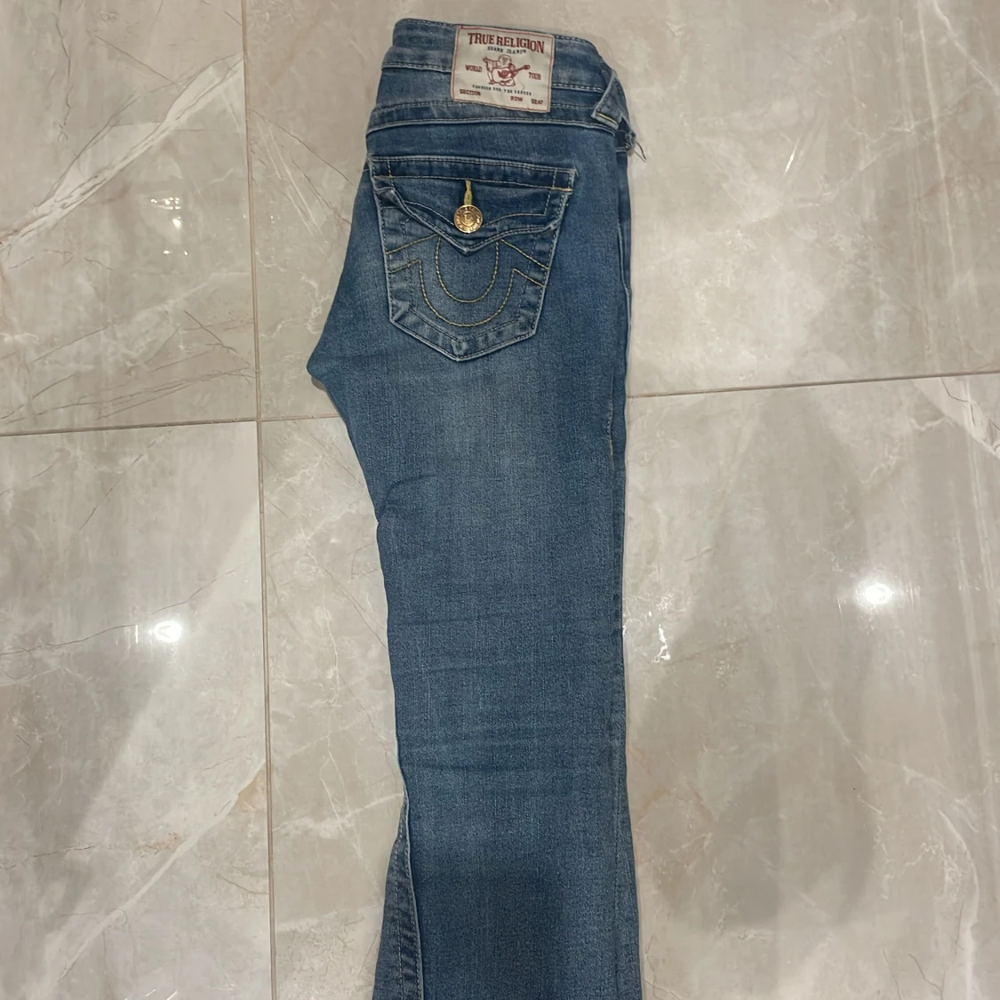 Säljer ett par blå True Religion Joey jeans med låg midja och utsvängda ben. Jeansen har snygga guldknappar på bakfickorna, klassiska kontrastsömmar och en ikonisk True Religion patch bak. Tillverkade i jeansmaterial och har en riktigt cool flare-modell. Skriv om ni har några frågor eller funderingar!