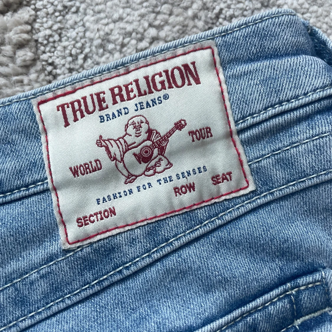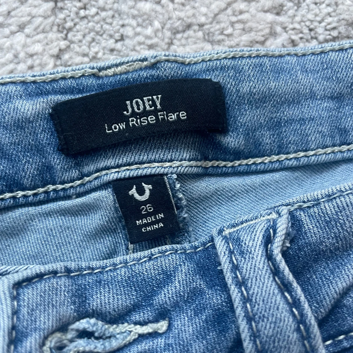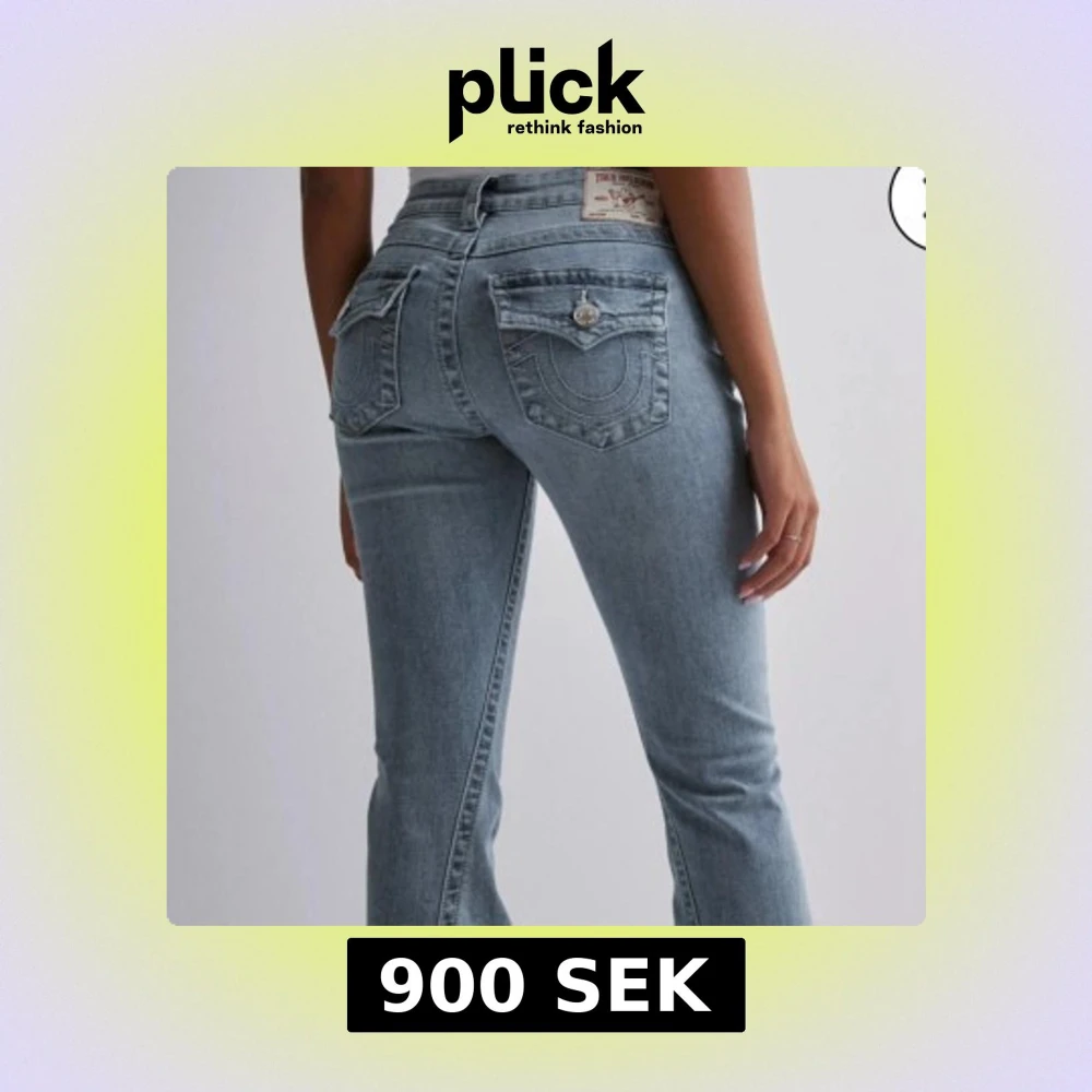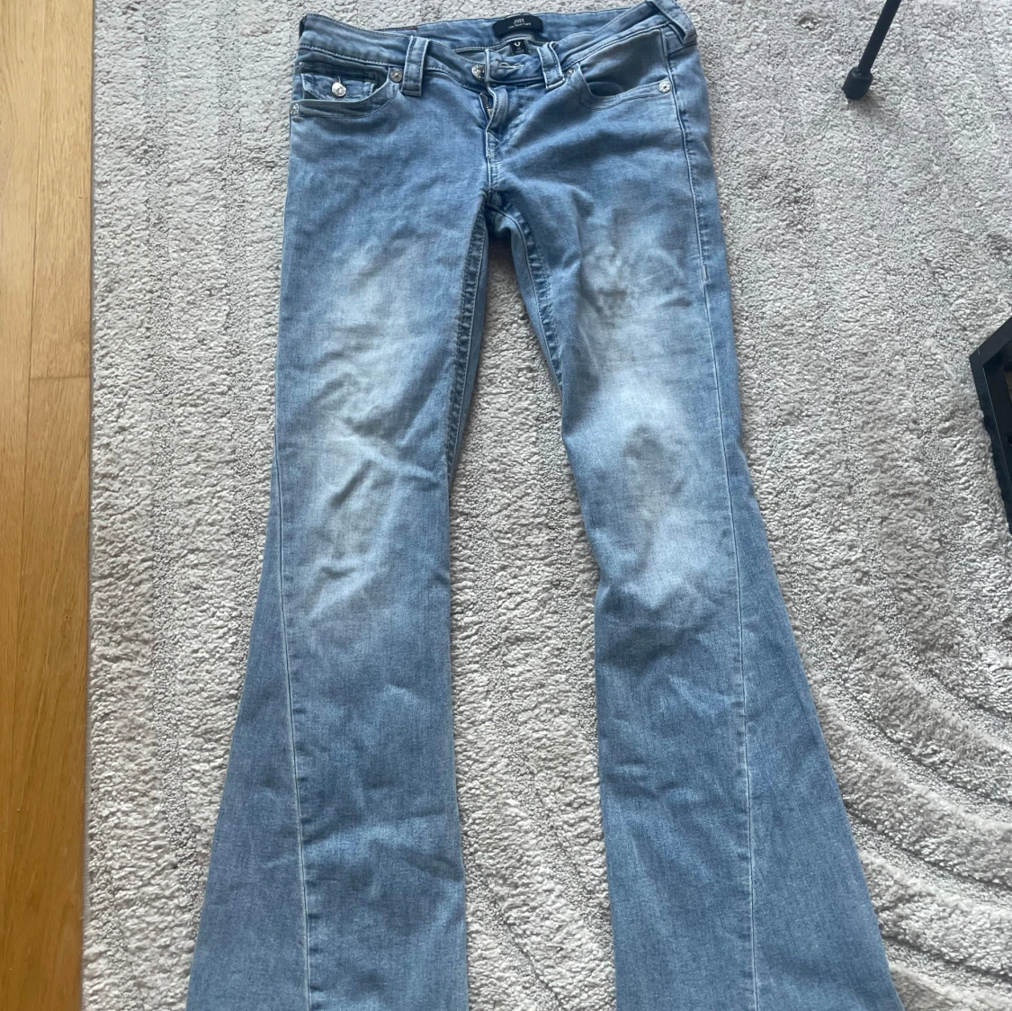 Säljer ett par ljusblå True Religion Joey jeans med låg midja och utsvängda ben. Klassiska bakfickor med lock och silverknappar, samt tydliga sömmar. Jeansen är i mjuk denim