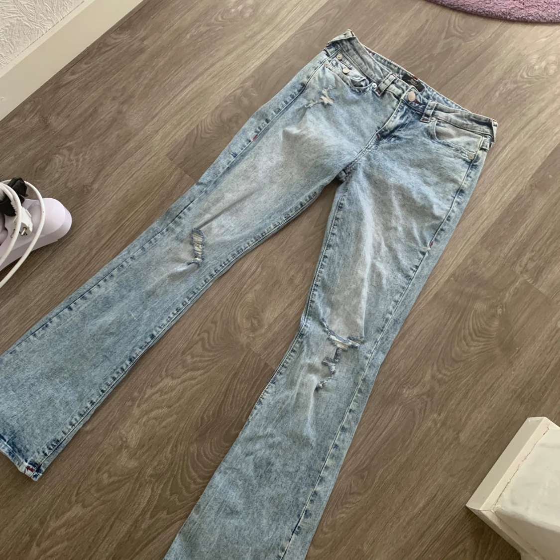 Använt endast 2 gånger så de är som nya. Har tvättats. De är i storlek 28, men passar mig som vanligt vis brukar ha 36 och 38 i Jeans. Jag är 166cm och jag tycker om längden. Brukar vika upp de lite ändå. Kommer tyvärr inte gå ner mera i pris då dessa är typ helt nya. 💗Skriv ifall ni vill ha mått