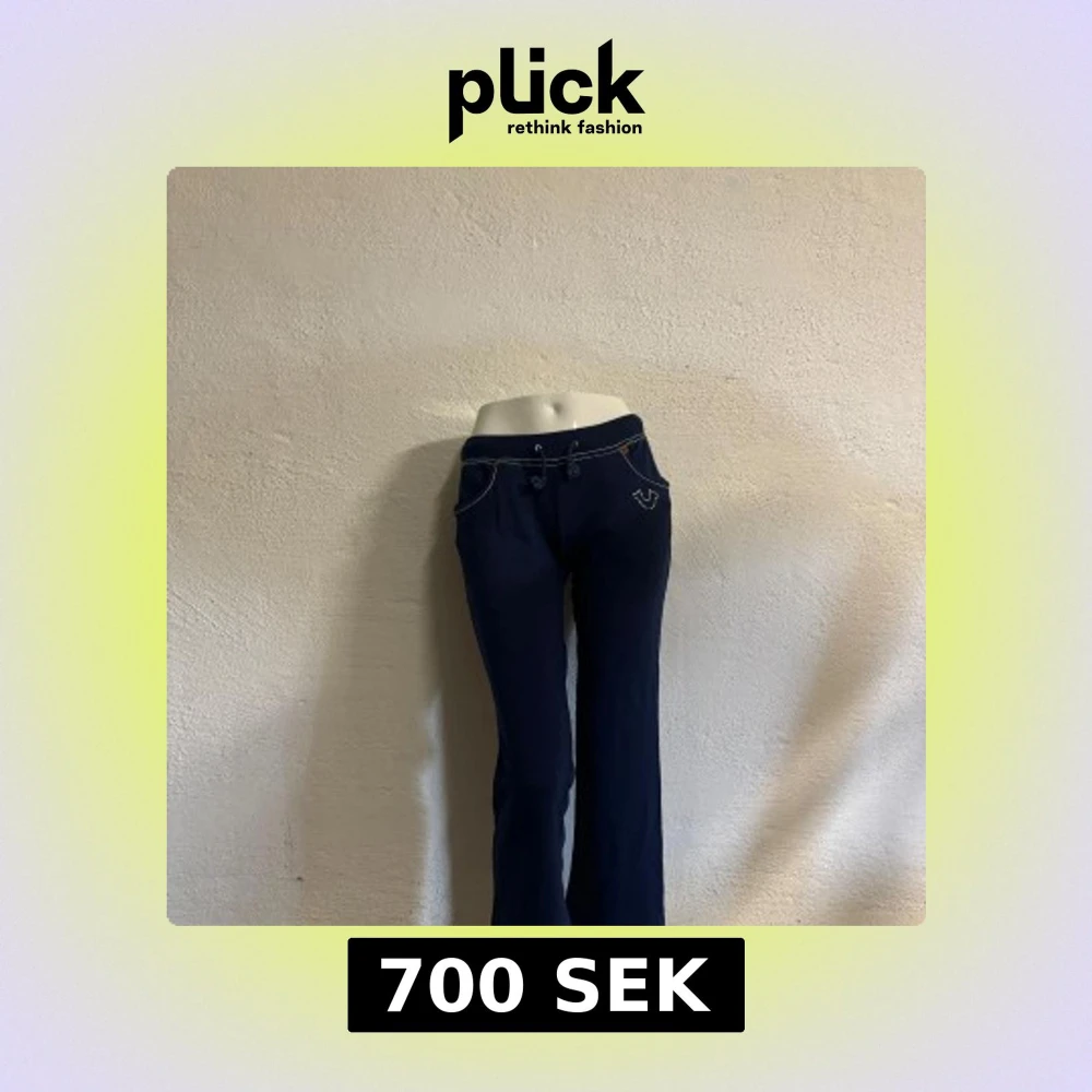 Mörkblå mjukisbyxor från True Religion med vita kontrastsömmar och snörning i midjan. Byxorna har bootcut-modell och broderad logga på fickan. Står storlek L men passar mer som en S.