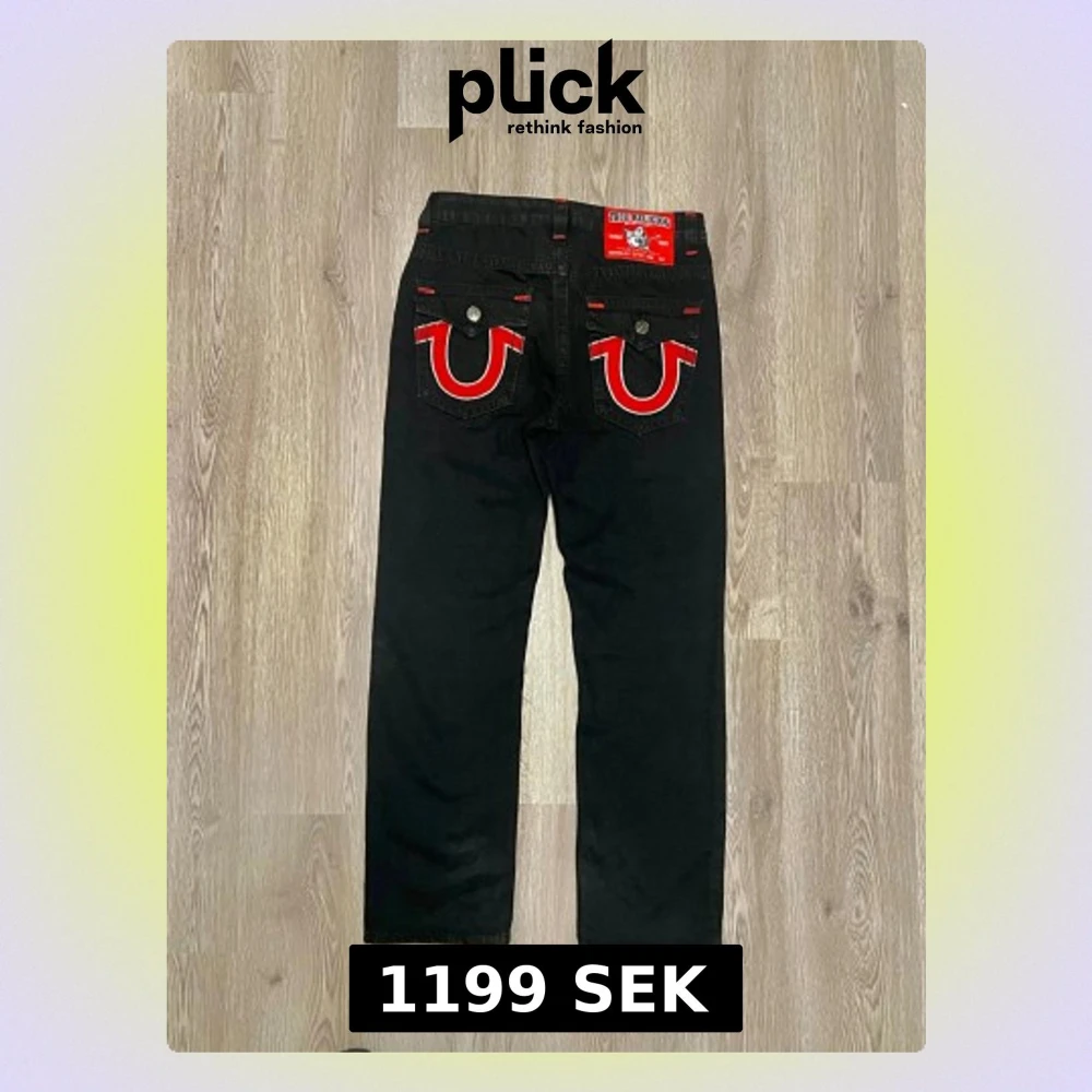 Svarta jeans från True Religion, modell Joey Super T. Använde dom 2-3 gånger. Snygga kontrastsömmar i rött och silverfärgade knappar. Bakfickorna har ikonisk broderad logga i rött och vitt. Klassisk rak passform och robust jeansmaterial. Perfekt för dig som gillar streetwear med attityd. Längd: 112 cm Midja: 42 Raise: 27 Lår: 26