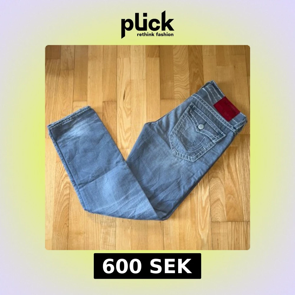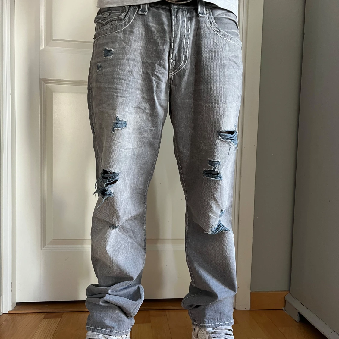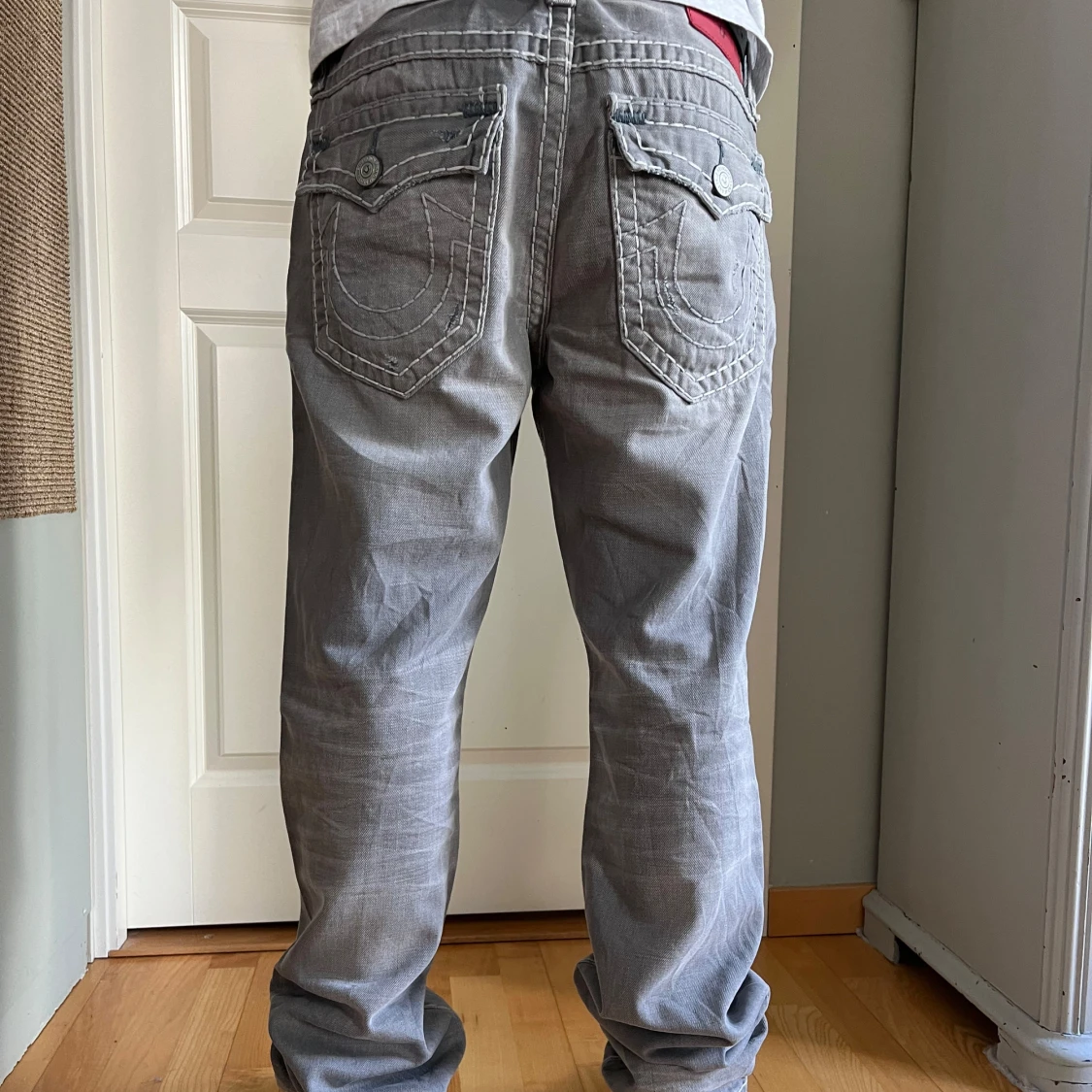 Säljer ett par gråa jeans från True Religion. Använda fåtal gånger i nytt skick. Storlek 34 men passar även med bälte till mig som brukar ha 30/32.