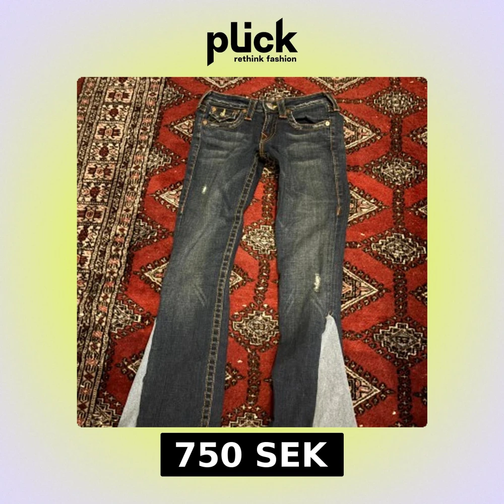 Säljer ett par mörkblå jeans från True Religion med tydliga kontrastsömmar i orange och vit. Klassisk femficksmodell med snygga detaljer på bakfickorna och logopatch. Jeansen har raka ben och är tillverkade i slitstarkt denim.