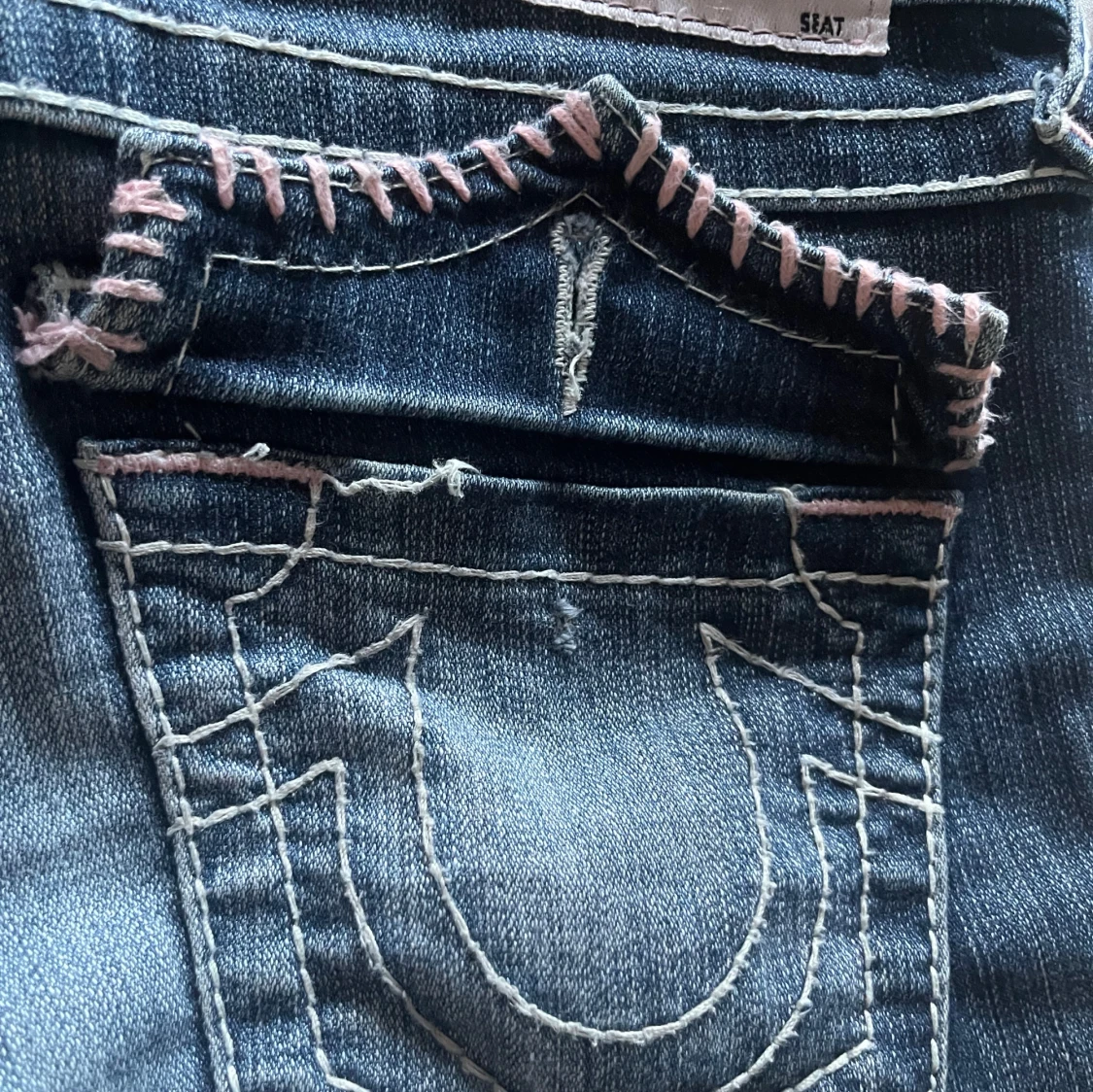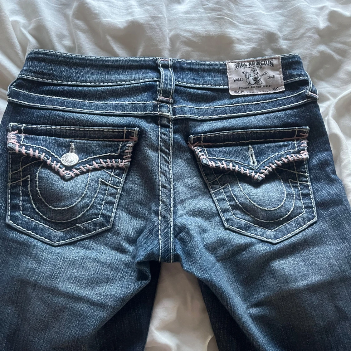 snygga lĂ„ga true religion jeans med rosa detajlerđde Ă€r i bra skick förutom att knappen pĂ„ en av bakfickorna har lossnat vilket syns pĂ„ sista bilden!! jag Ă€r 165 o de passar bra i lĂ€ngdenđ