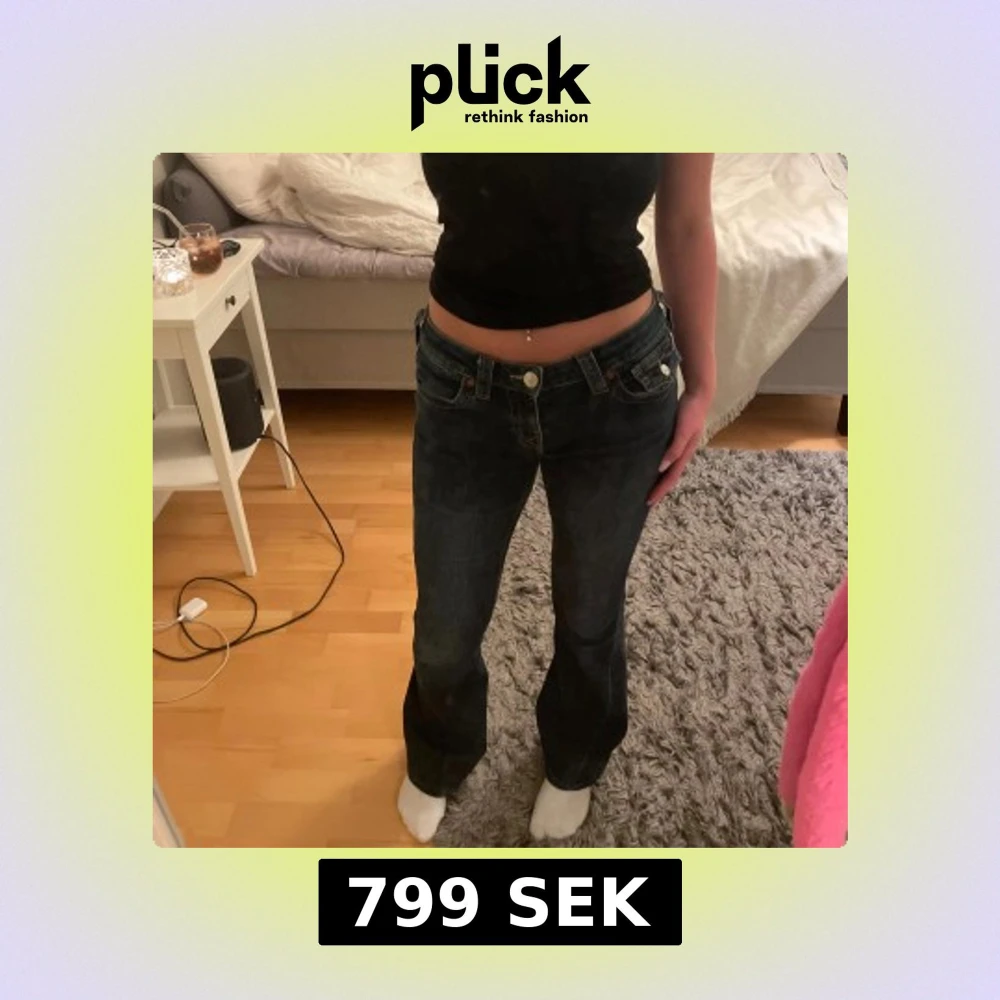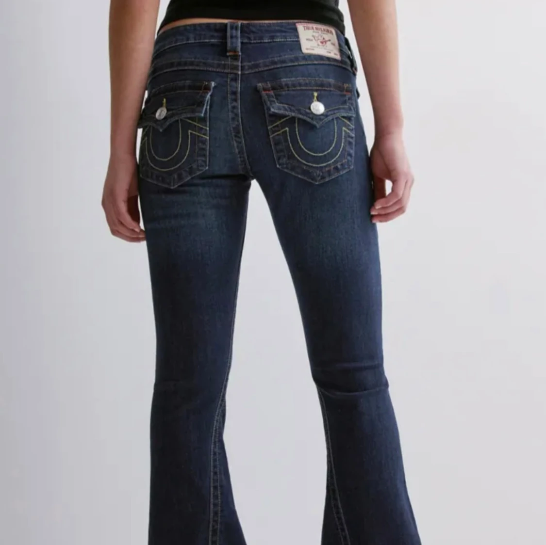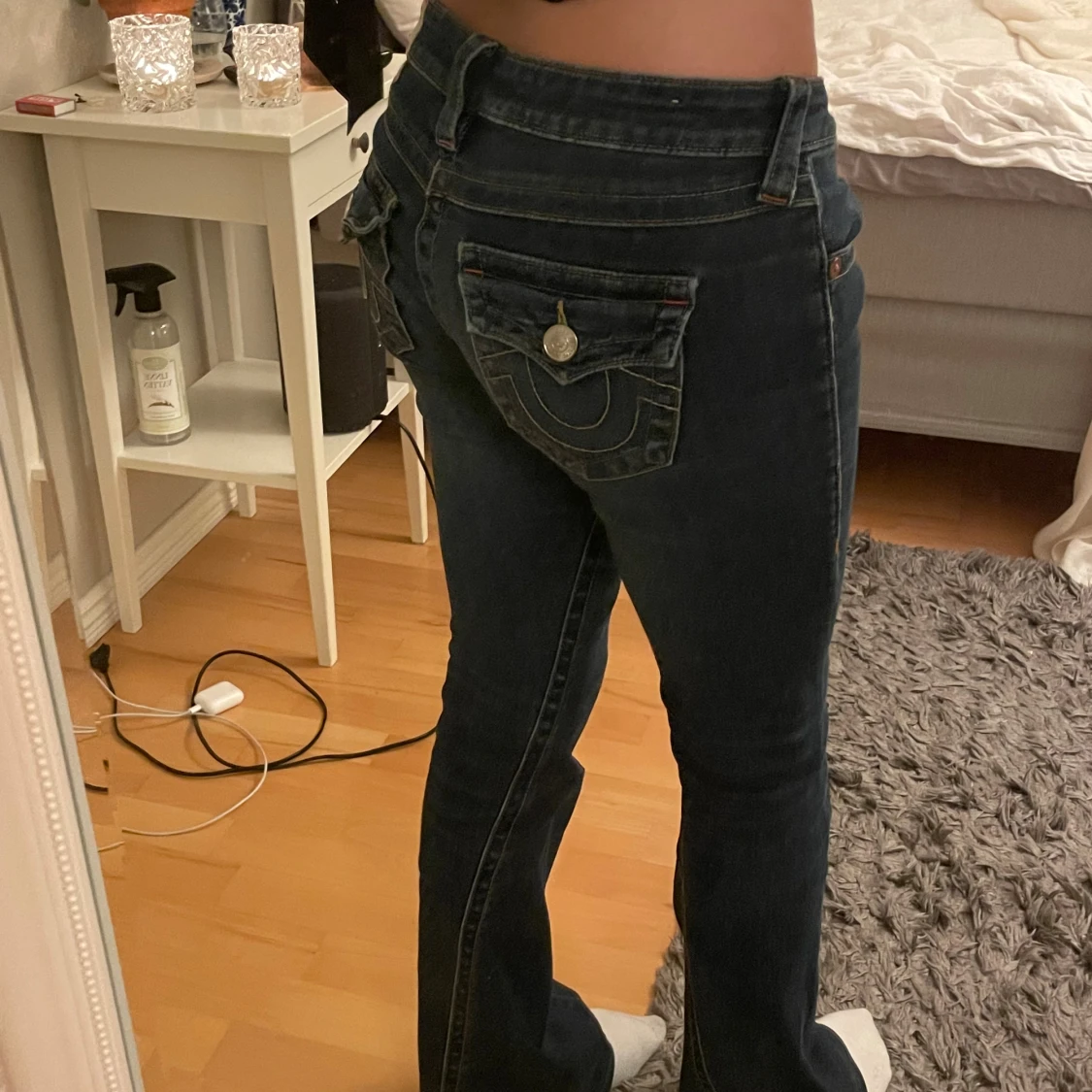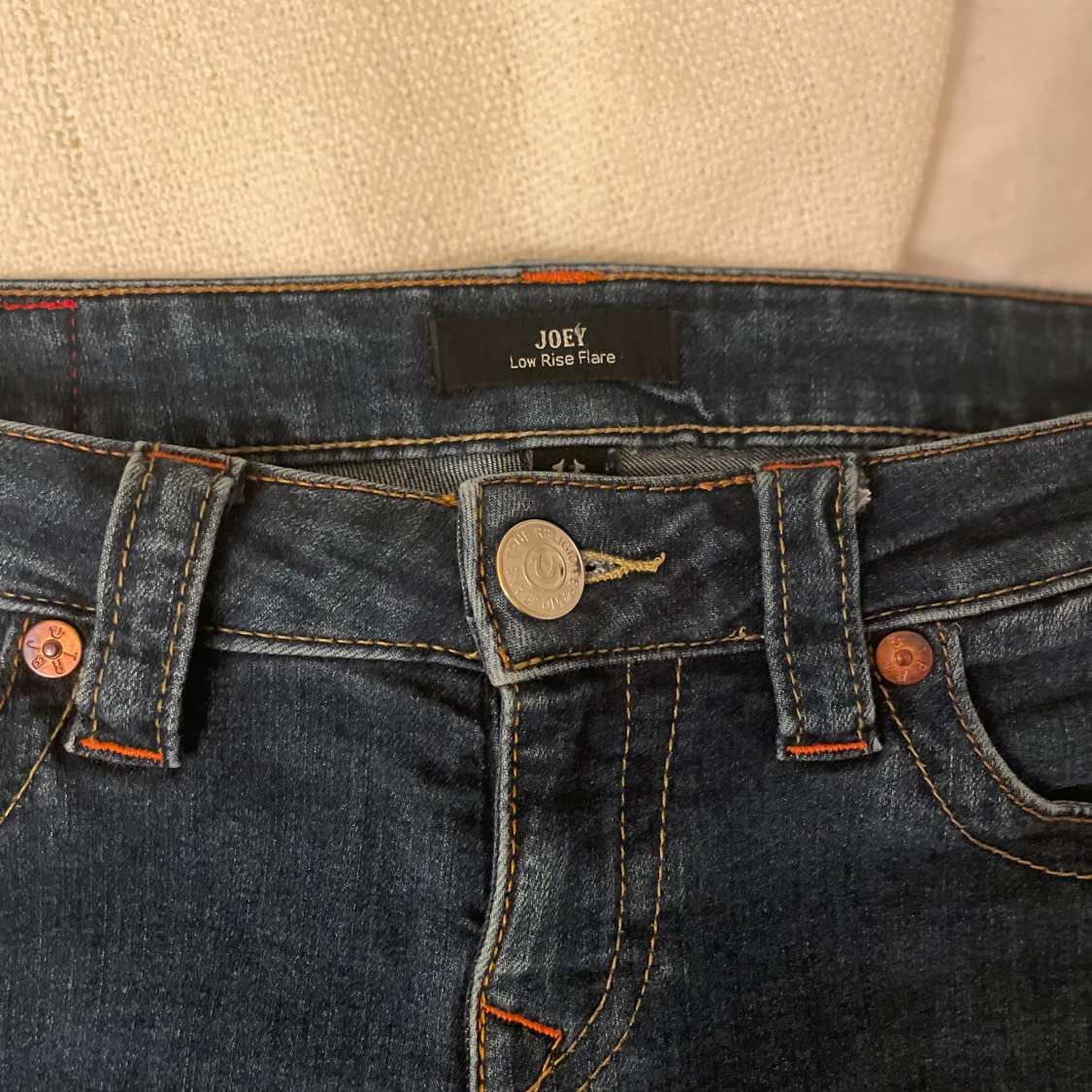 Säljer ett par mörkblå True Religion Joey jeans med låg midja💗 storlek 25 och uppsydda i benen, är precis ner till golvet på mig som är 164.