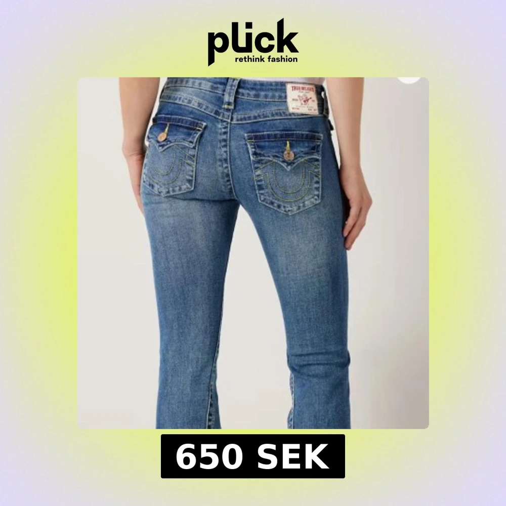 Snygga blå jeans från True Religion med bootcut passform och klassisk gul kontrastsöm på bakfickorna. Jeansen har normal midja, knappstängning och detaljerade ficklock med metallknappar. Perfekt för dig som gillar en retro vibe och vill sticka ut med coola detaljer. Har tappat en knapp men inget man tänker på. Köpte för 1400kr💓