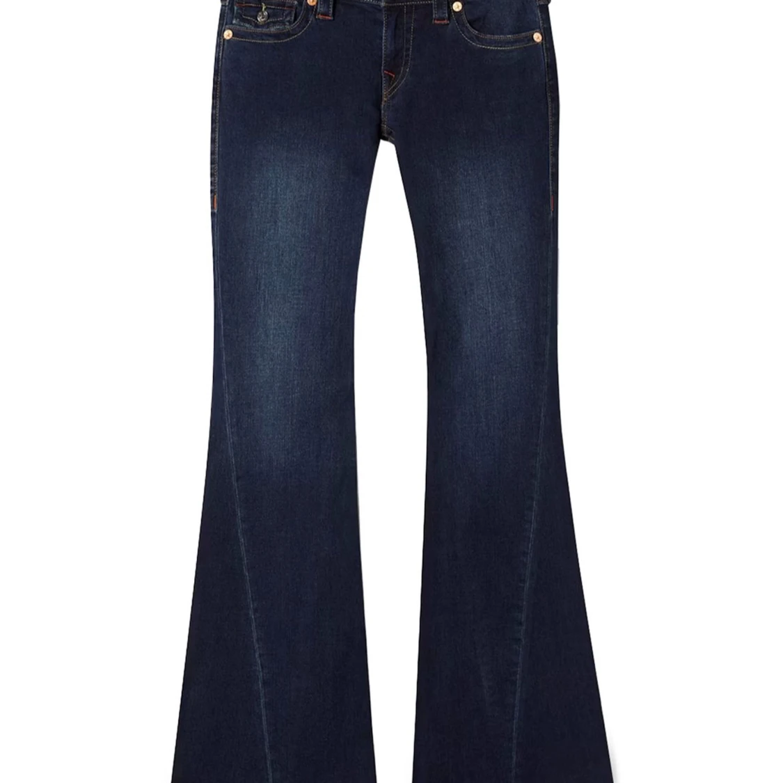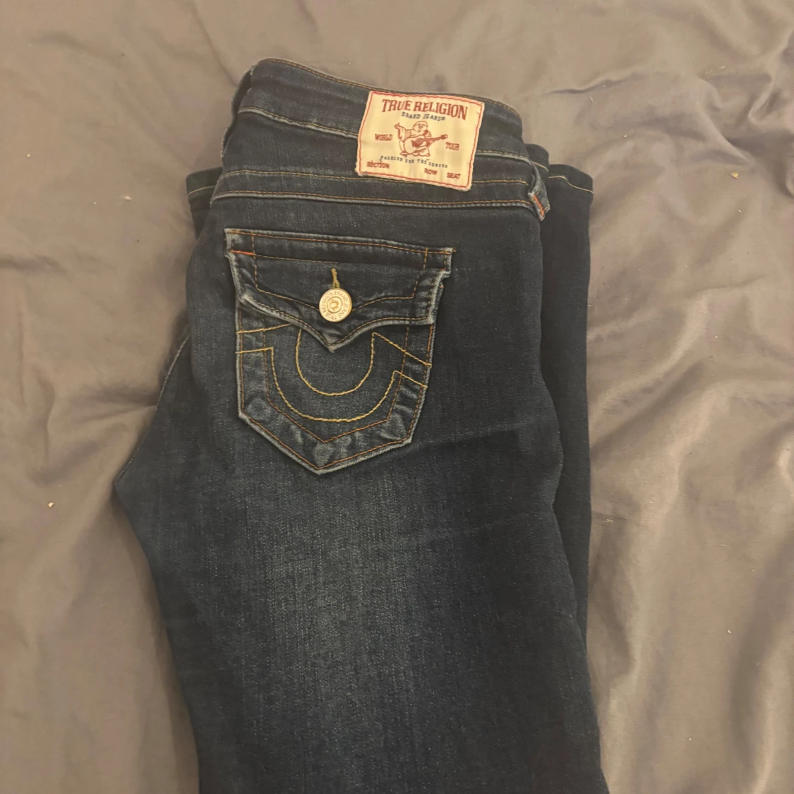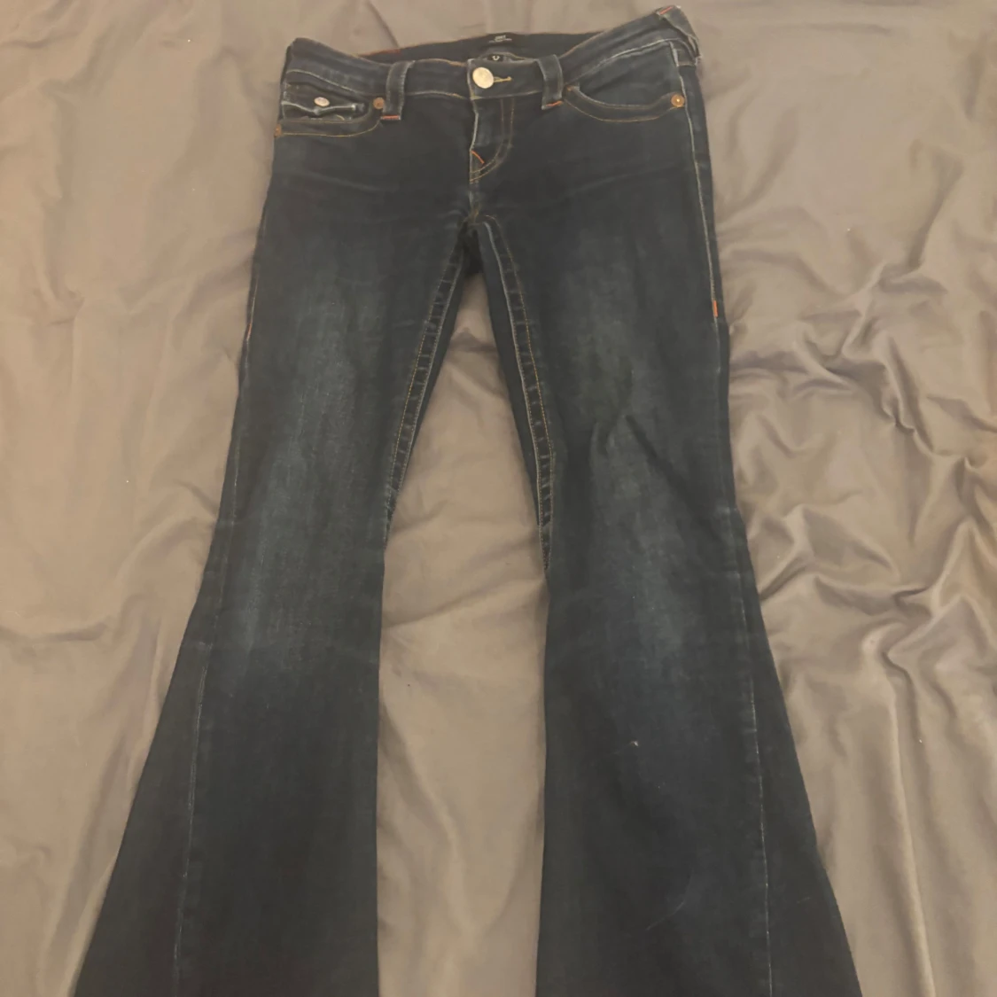 Säljer ett par mörkblå bootcut jeans från True Religion i modellen joey lowrise flare med ikoniska kontrastsömmar och snygga fickdetaljer. Jeansen har låg midja och är tillverkade i klassiskt denimtyg. Perfekta för dig som gillar en retro och trendig look. De är lite uppsydda i nedre kanten så passar någon som är 160-165.
