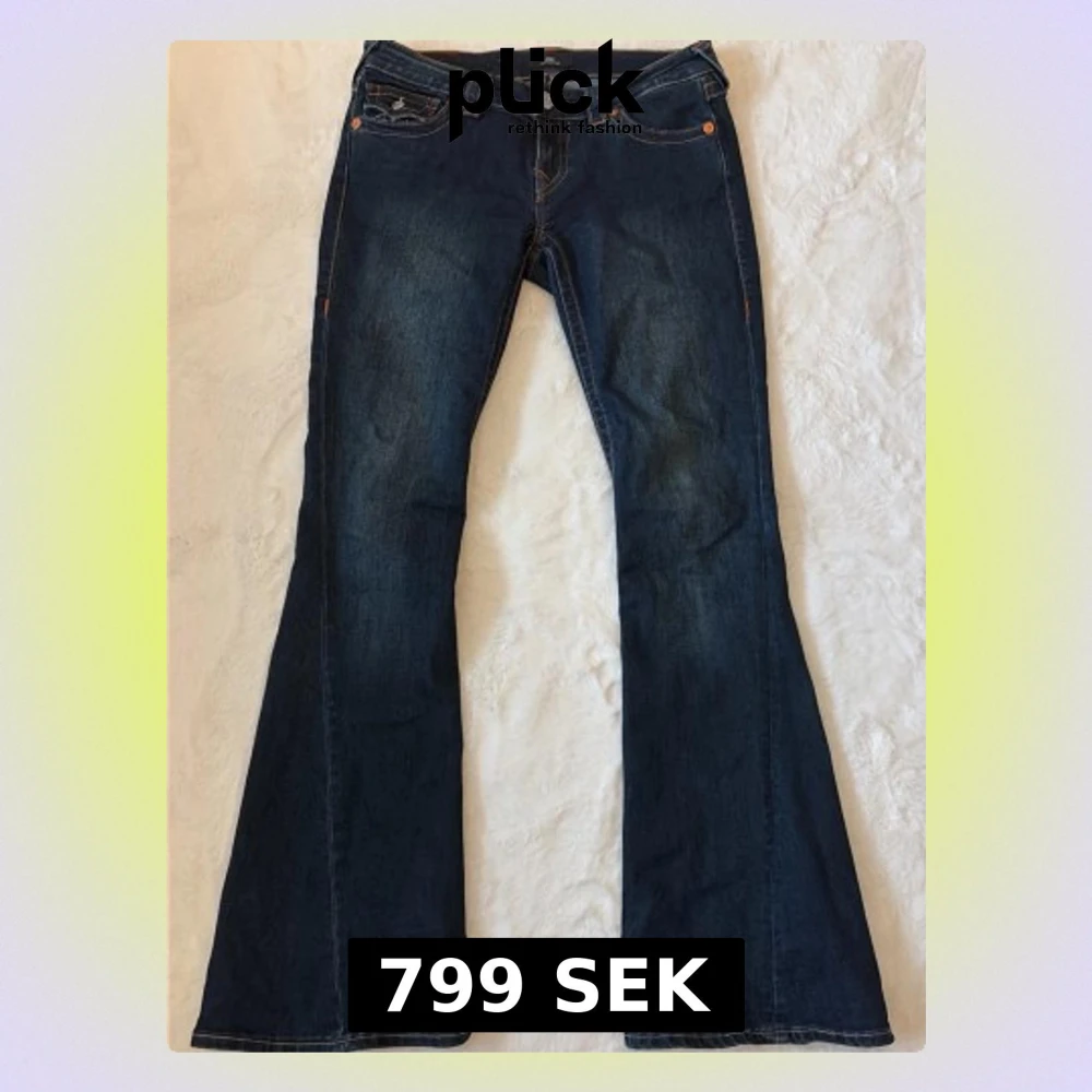 Säljer ett par mörkblå jeans med riktigt utsvängda ben och klassisk bootcut-modell. Jeansen har en snygg tvätt och kontrastsömmar som ger extra detaljer. Perfekta för dig som vill ha en retro och trendig look.