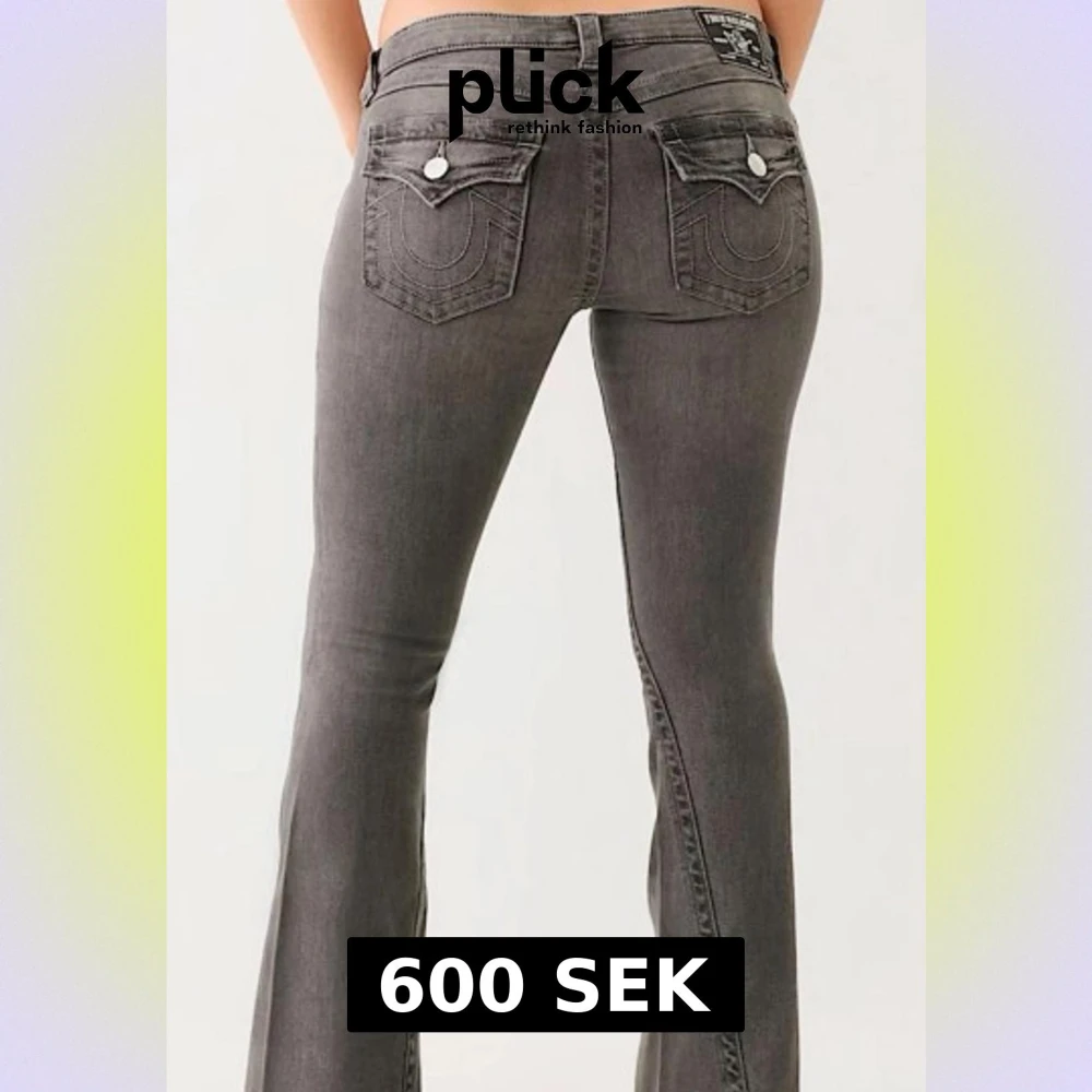Snygga grå jeans från True Religion med bootcut passform. Jeansen har dekorativa bakfickor med lock och silverfärgade knappar samt tydliga sömmar. Klassisk femficksmodell i stretchigt denimtyg som sitter tajt upptill och släpper vid benslutet.