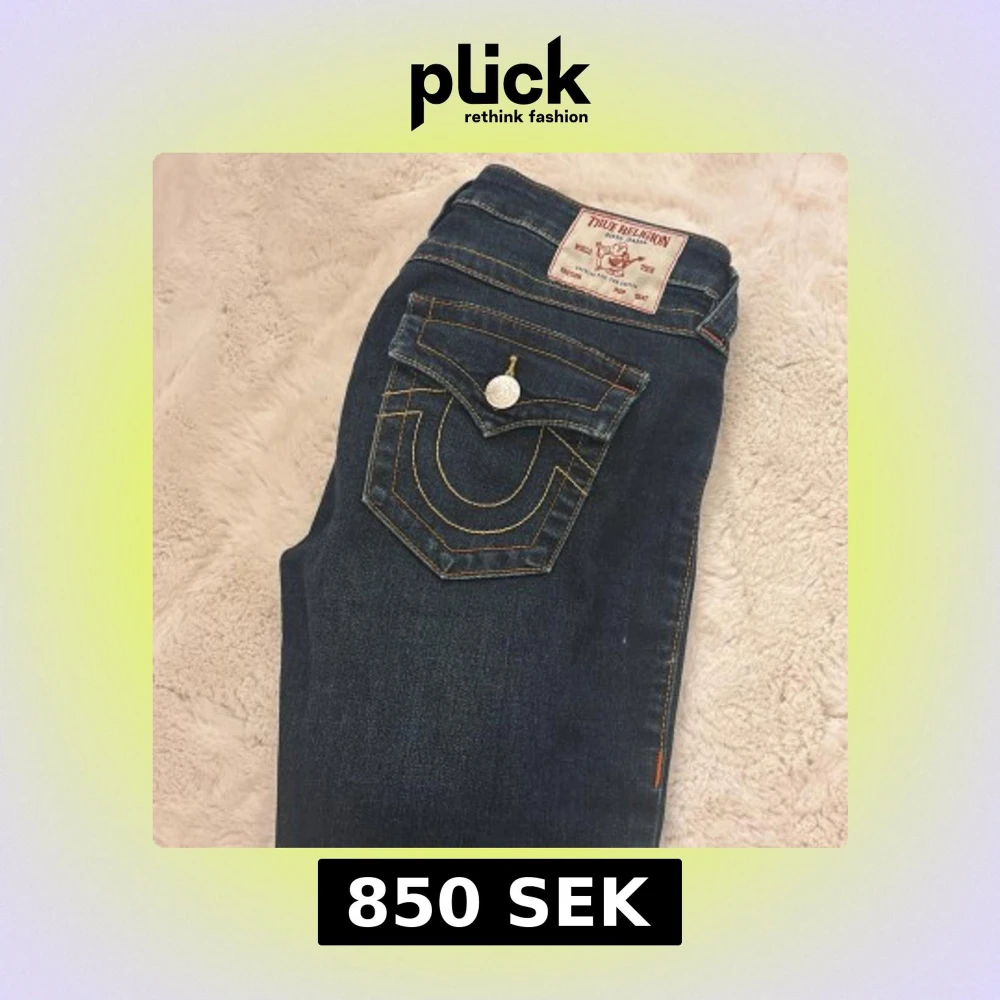 Snygga mörkblå jeans från True Religion med låg midja och flare-stil. De har dekorativa sömmar och en knappdetalj på bakfickan. Perfekta för en trendig look!