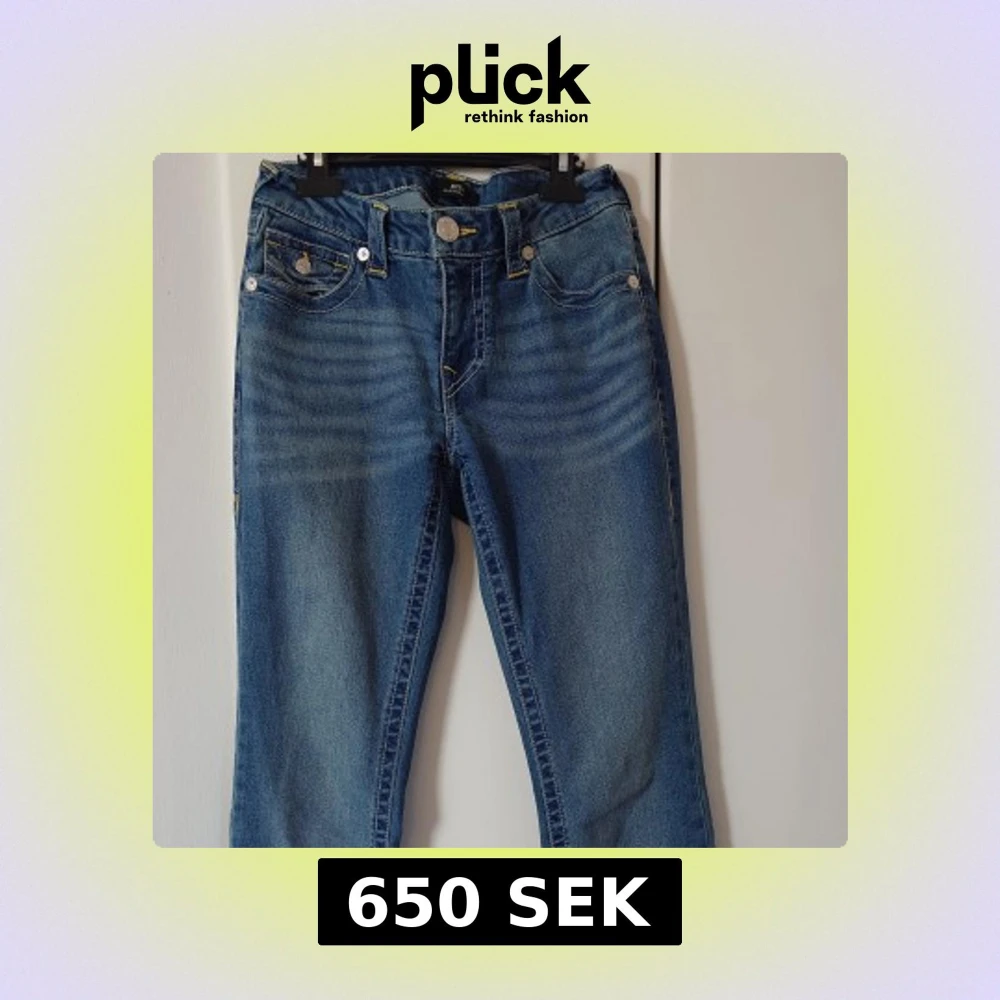 Säljer ett par blå jeans från True Religion med tydliga kontrastsömmar och snygga bakfickor med lock och dekorativa knappar. Klassisk femficksmodell med gylf och knapp, tillverkade i bomullsmix för skön stretch. Perfekta för dig som gillar streetwear vibes.
