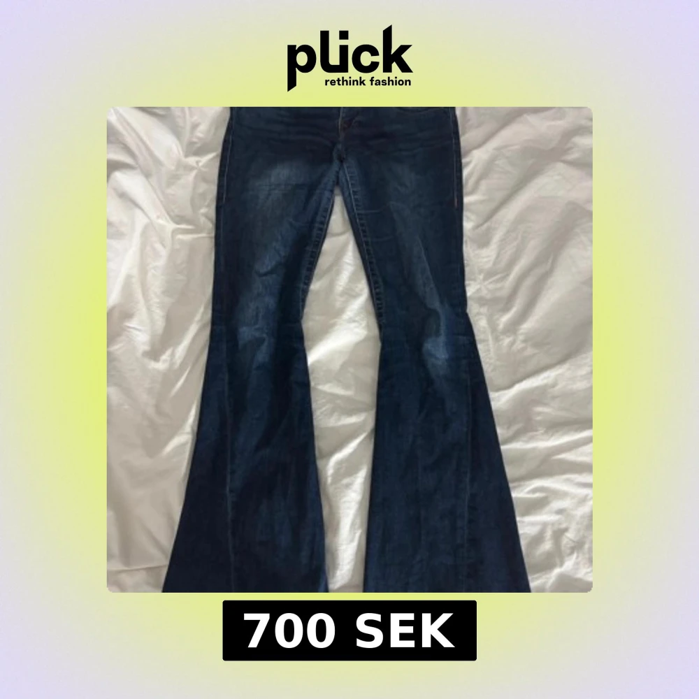 Snygga mörkblå jeans från True Religion med bootcut passform och klassiska broderade bakfickor med lock och knappar. Lite deffekter mellan benen men har sytt ihop de.