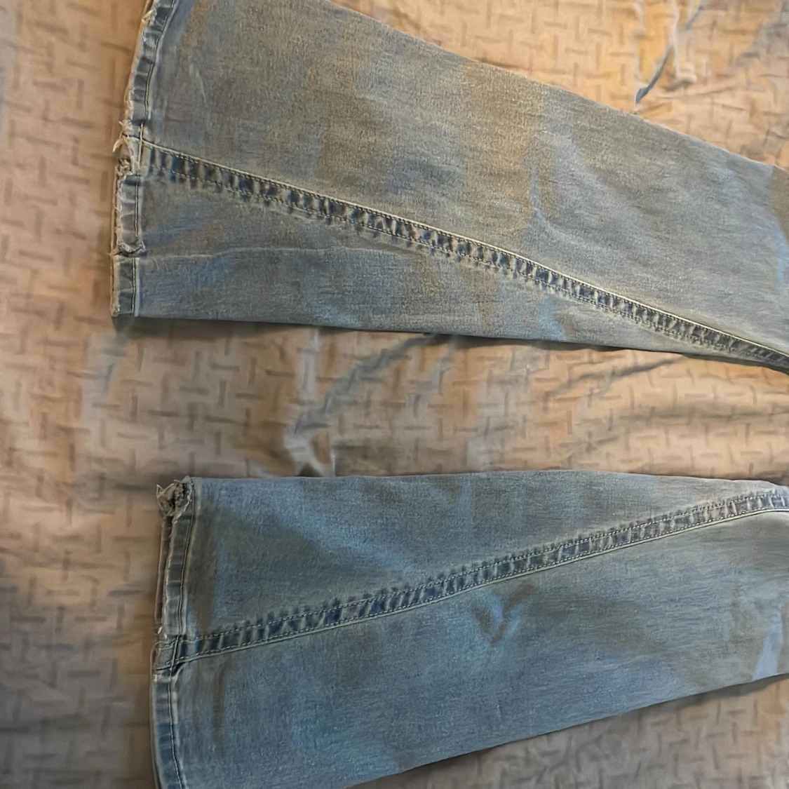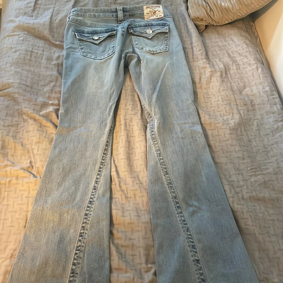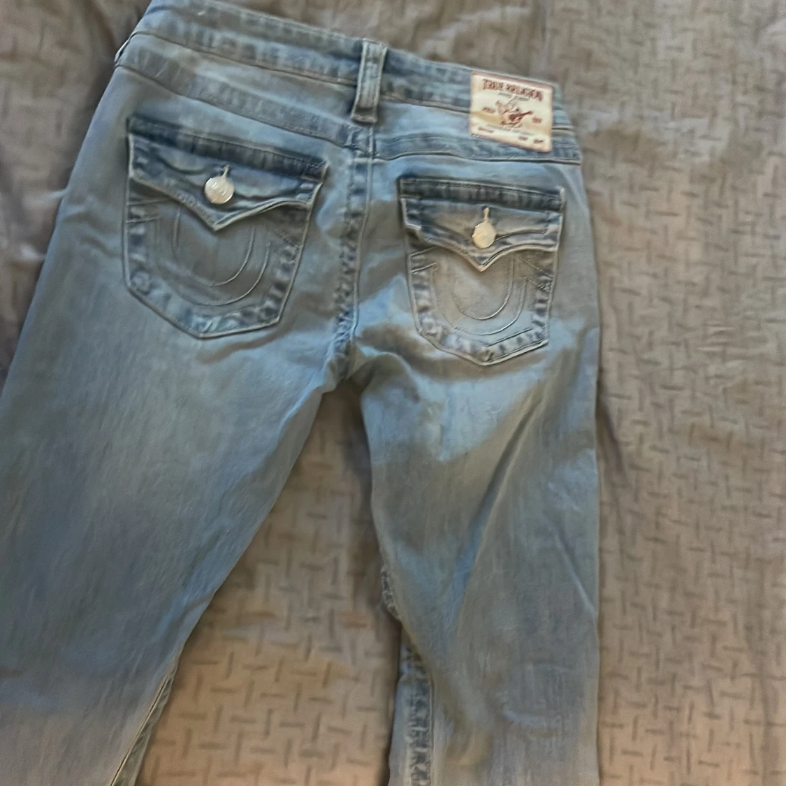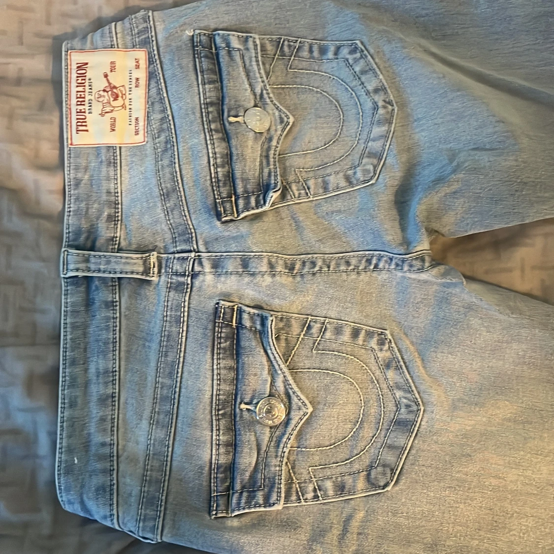 Säljer ett par ljusblå jeans från True Religion med klassiska kontrastsömmar och stora bakfickor med lock och knappar. Jeansen har bootcut-modell och är tillverkade i denim med snygg tvätt. Märkespatch bak i midjan och detaljerade fickor ger en unik look. Pris går såklart att diskutera, jag säljer pågrund av att jag har så många par jeans. Jeansen passar dig som är 160 och uppåt.