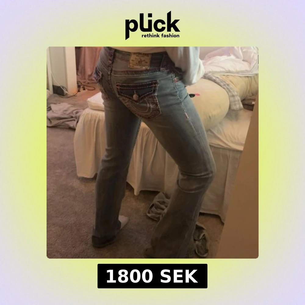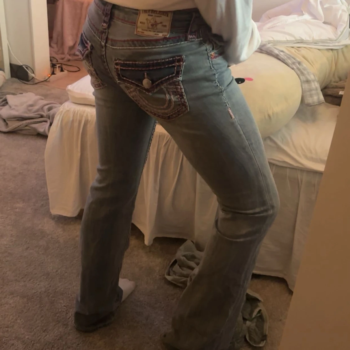 Säljer ett par ljusblå jeans från True Religion med snygga kontrastsömmar och detaljerade bakfickor med lock och knapp. Jeansen har bootcut-modell. Bara andvänt 4 gånger utmärkt skick original pris 2200
