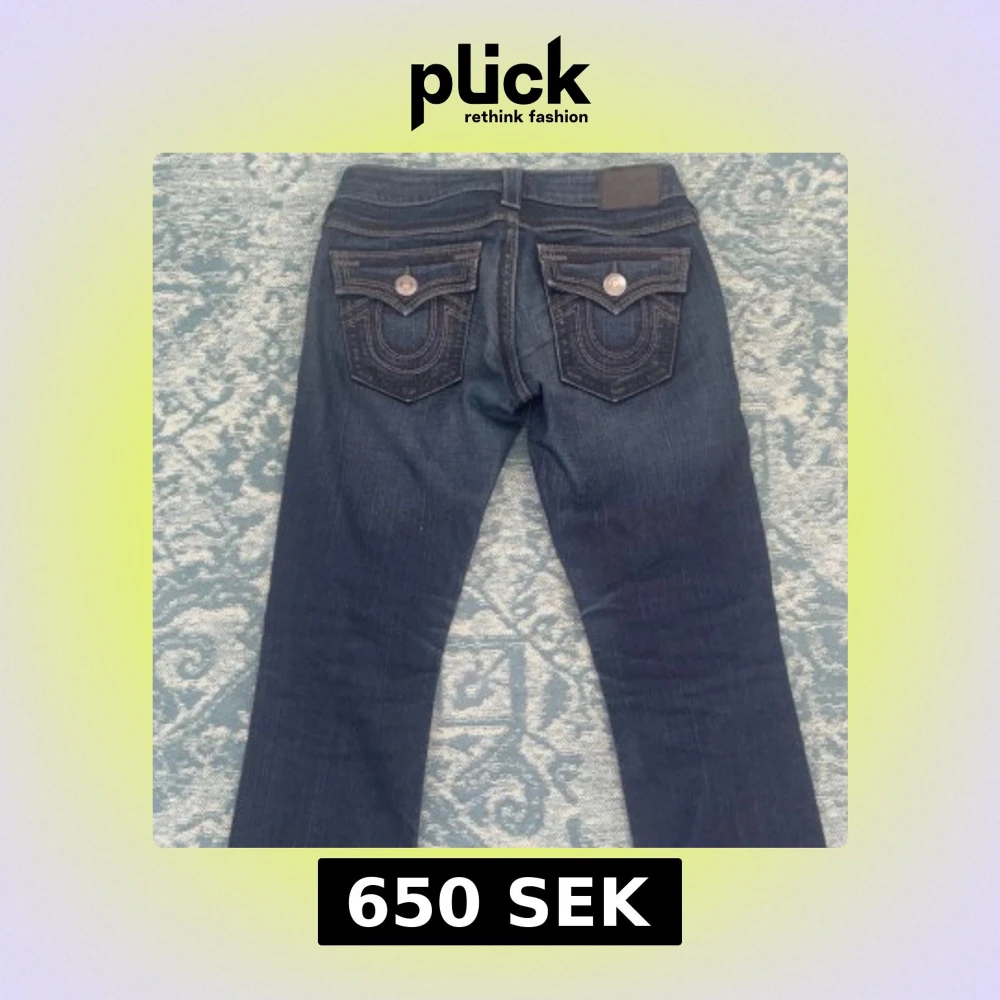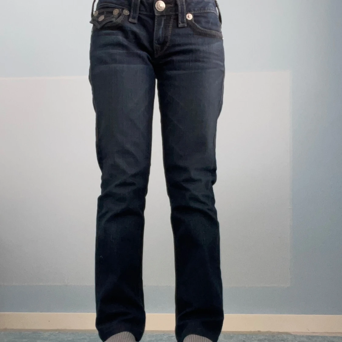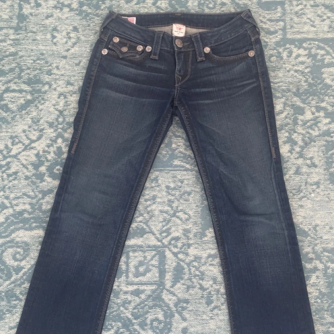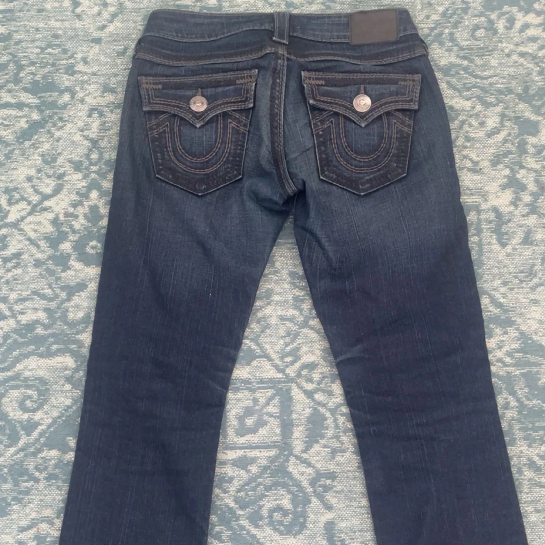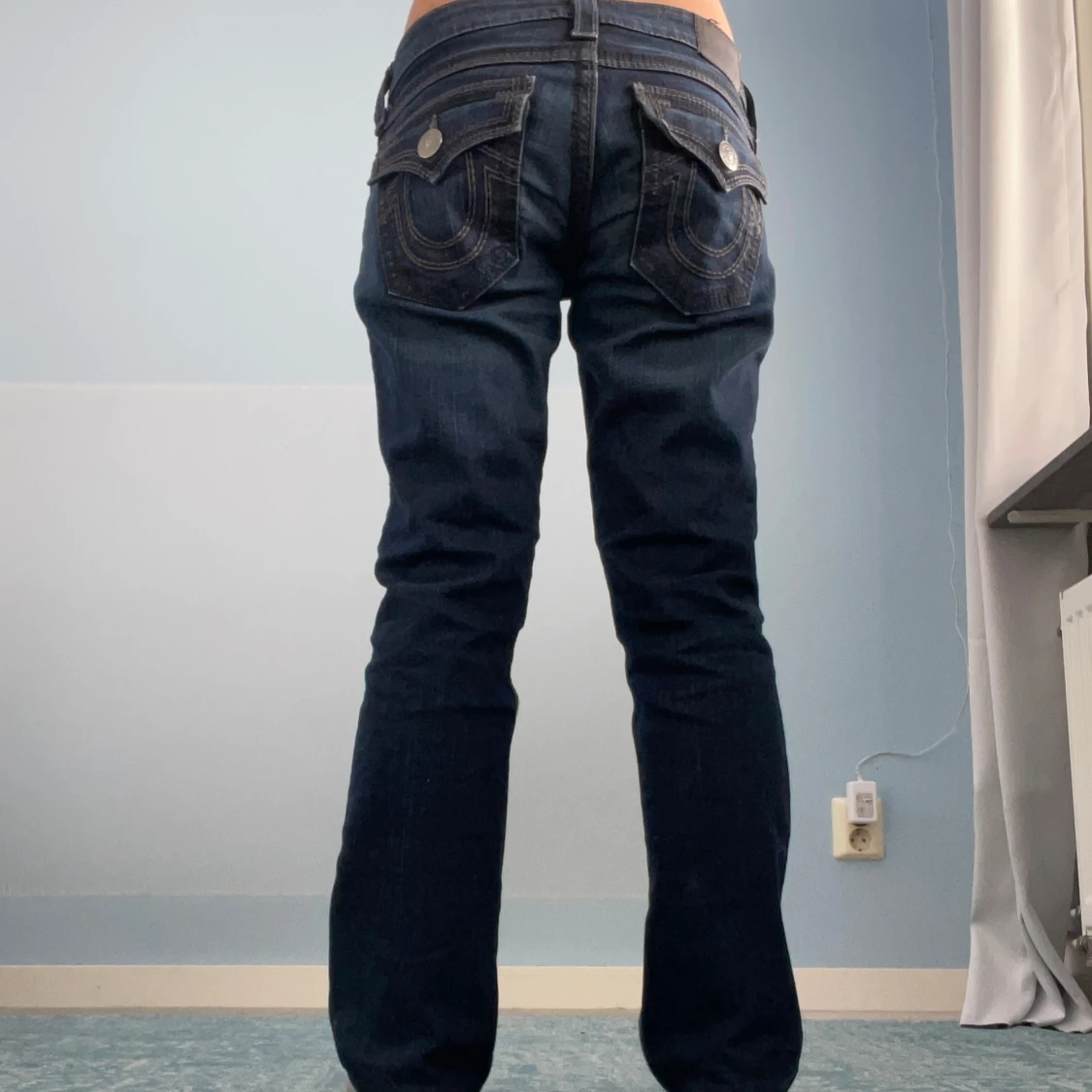 Vintage mörkblå jeans från True Religion, extremt lågmidjade med bakfickor och kontrastsömmar. Modellen har normal passform och raka ben och silverfärgade knappar. Som referens är jag 160 cm. Nypris 1100 kr. Kan mötas upp i Stockholm!