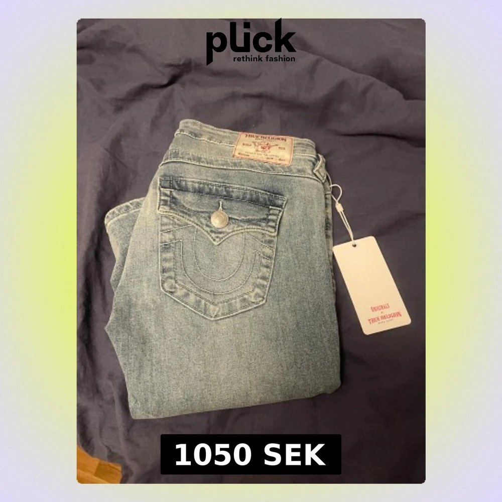 Säljer ett par ljusblå True Religion Joey jeans med låg midja och flare-ben. Klassisk femficksdesign med ikonisk broderad bakficka och silverfärgad knapp. Jeansen är i mjukt denim och har snygga detaljer som synliga sömmar och etikett bak. Dom är helt nya jag har bara provat dom på och säljer dom eftersom att dom var för stora.