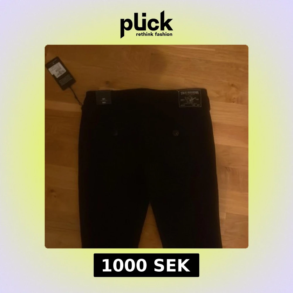 Svarta jeans från True Religion, modell Joey Low Rise Flare. Byxorna har låg midja och utsvängda ben,snygga detaljer med knappar framtill. Jag köpte fel storlek så dom är inte använda, därav varför lappen är kvar