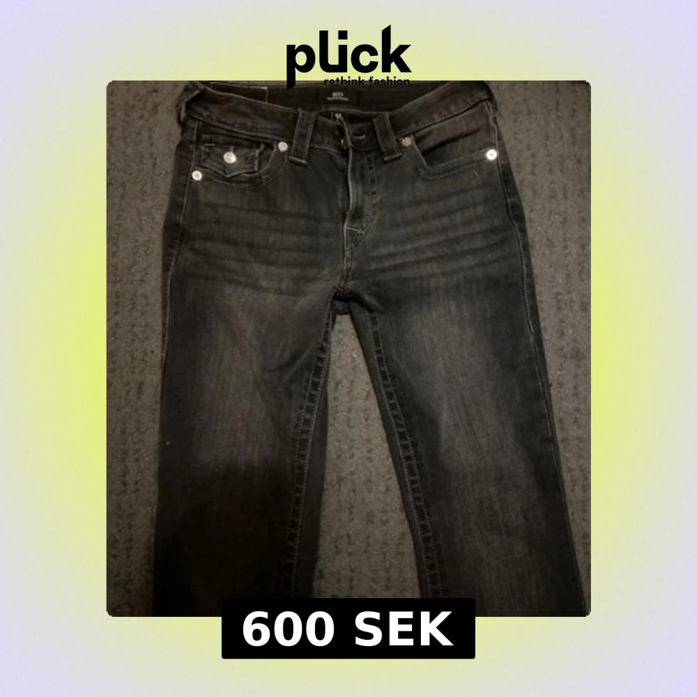 Säljer ett par svarta jeans från True Religion med klassiska sömmar och silverfärgade knappar på bakfickorna. Jeansen har utsvängda ben