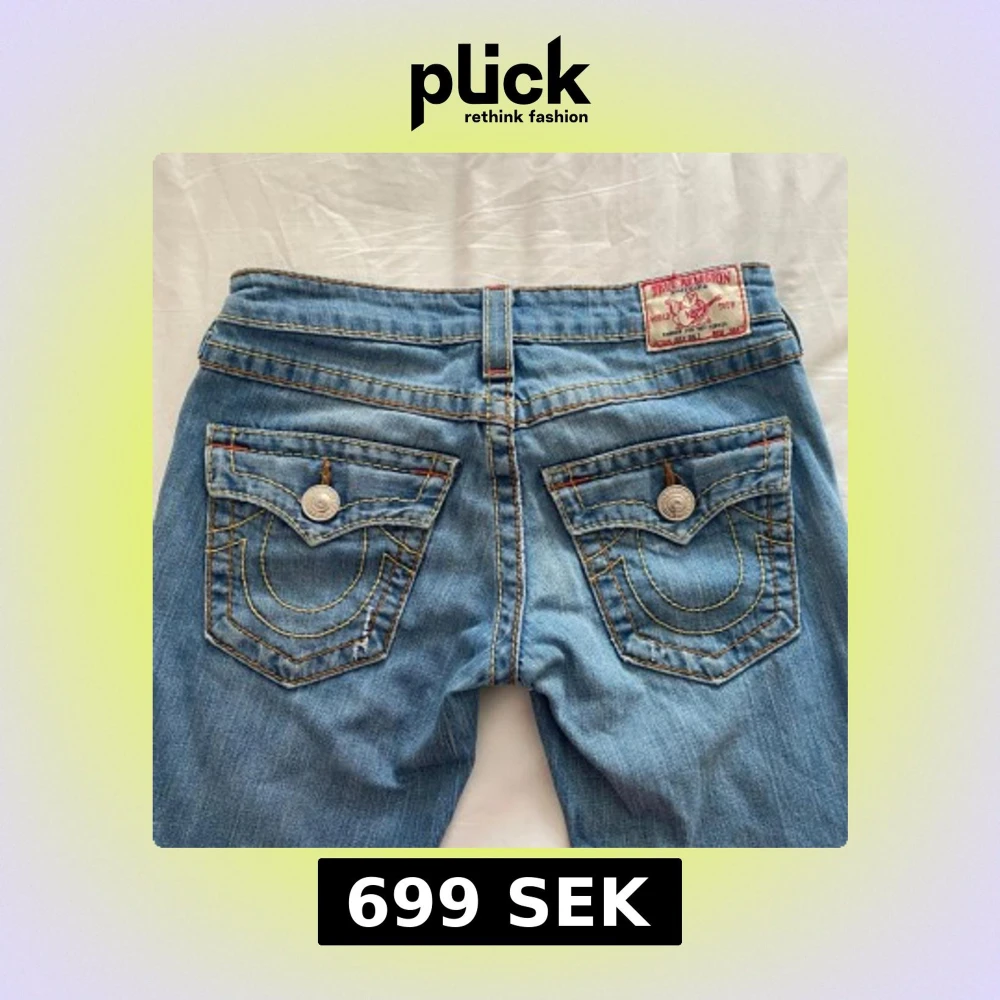 lågmidjade bootcut jeans från true religion. Bra skick och inga synliga tecken på användning. Storlek 27💘Innerbenslängd: 71cm Midjemått rakt över: 37cm