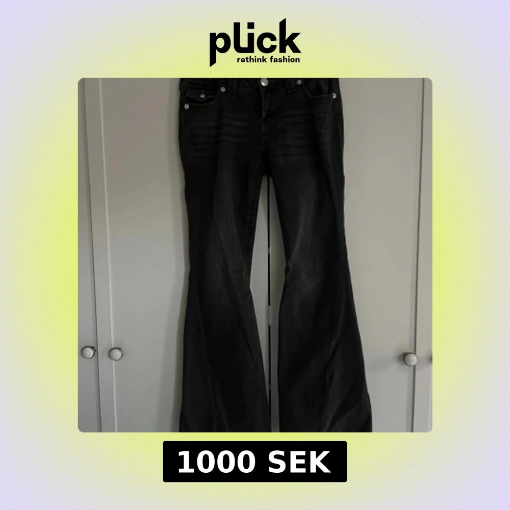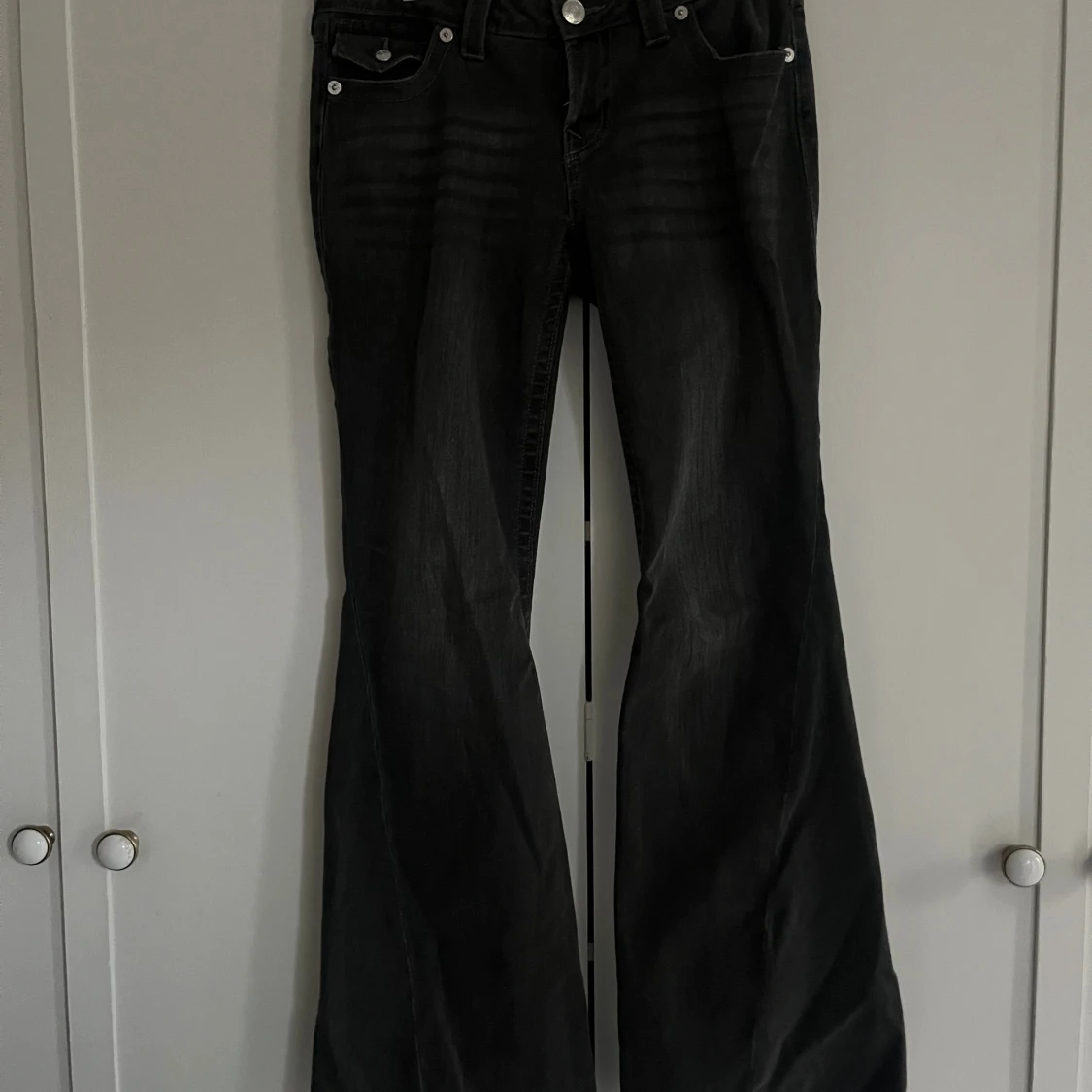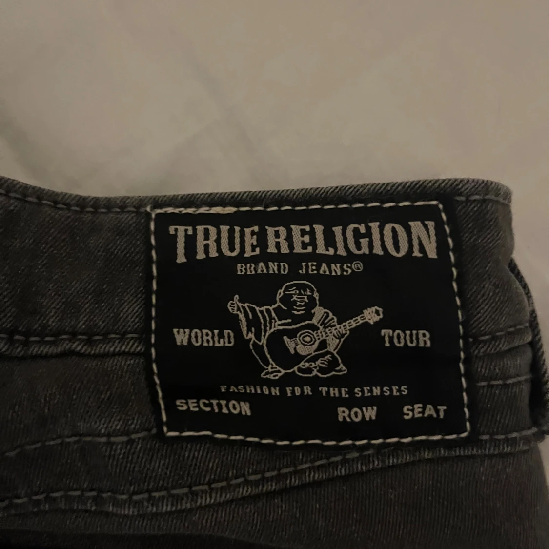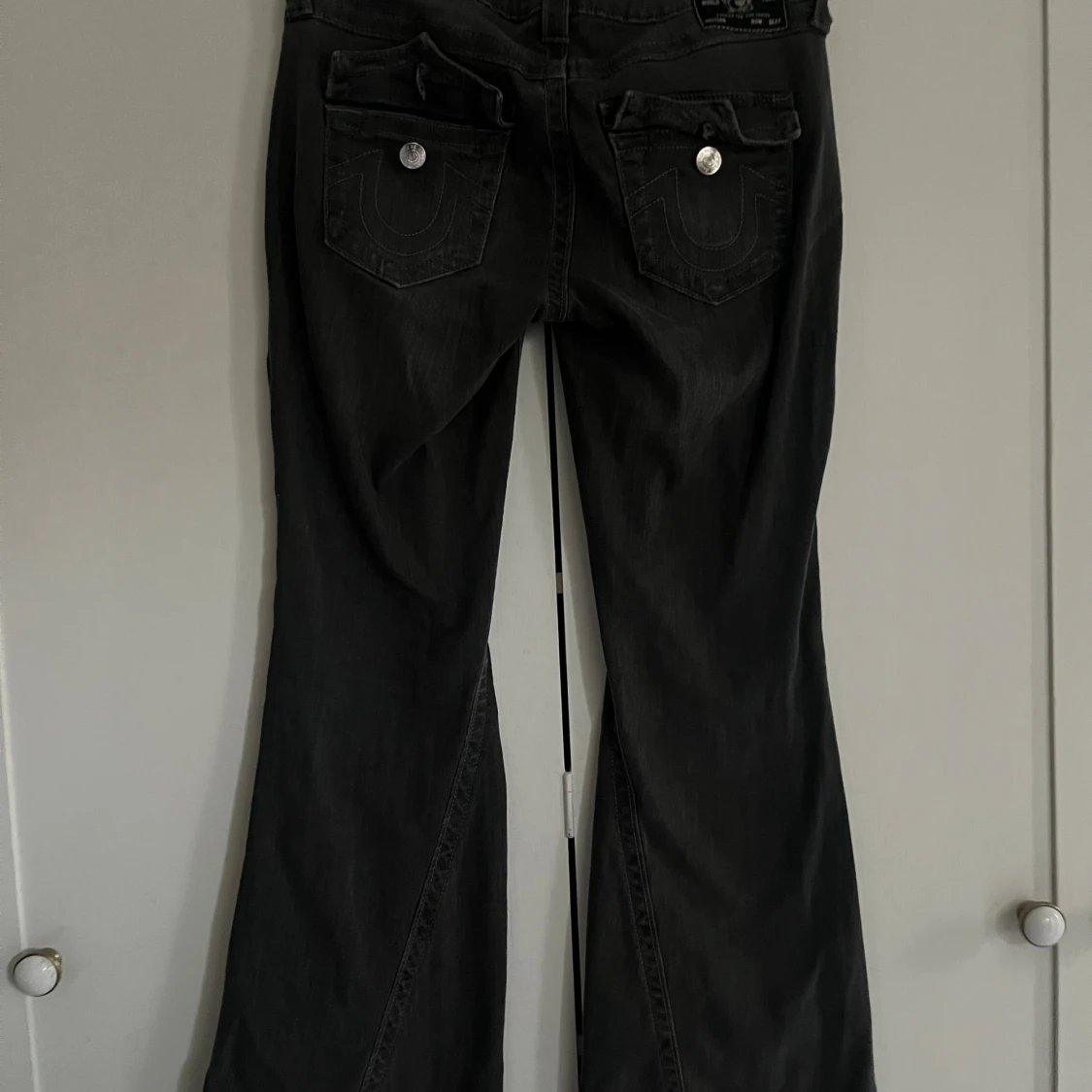 Säljer min tjejs jeans då de var för stora och hon är för lat för å sälja de. Svarta jeans från True Religion, modell Joey Low Rise Flare. Snygga detaljer med kontrastsömmar och stora fickor bak med silverknappar. Låg midja och utställda ben ger en cool retrovibe. Perfekta för dig som gillar statement-jeans med unik design. Aldrig använda då de var förstora.