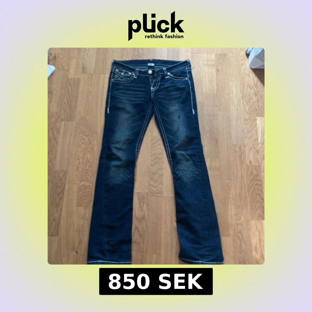 Snygga mörkblå jeans från True Religion med kontrasterande vita sömmar och klassiska femficksdesign. Jeansen har en bootcut-stil och är dekorerade med knappar och broderade detaljer på bakfickorna. Innebenslängden 78,5cm, midjemått 40 cm