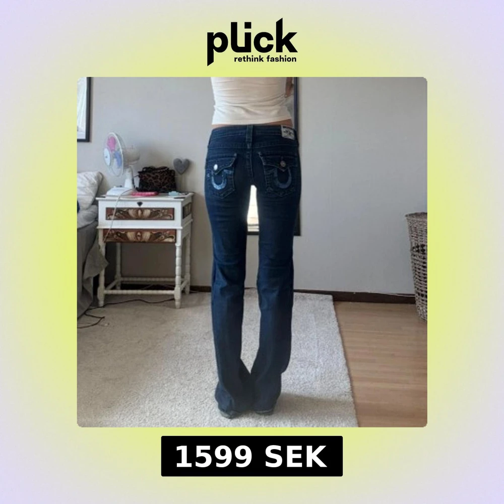 Snygga Lågmidjade True religon jeans. Med snygga detaljer på fickorna, utsydda. Midjemåttet tvärsöver är 38 cm och innerbenslängden är 85 cm. Något slitna längst ner men inget man lägger märket till. Passar en storlek S eller XS