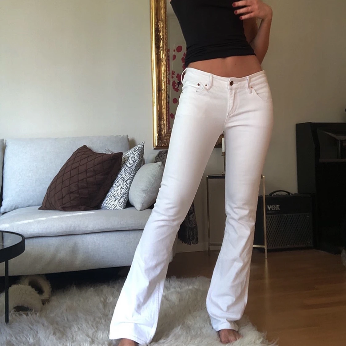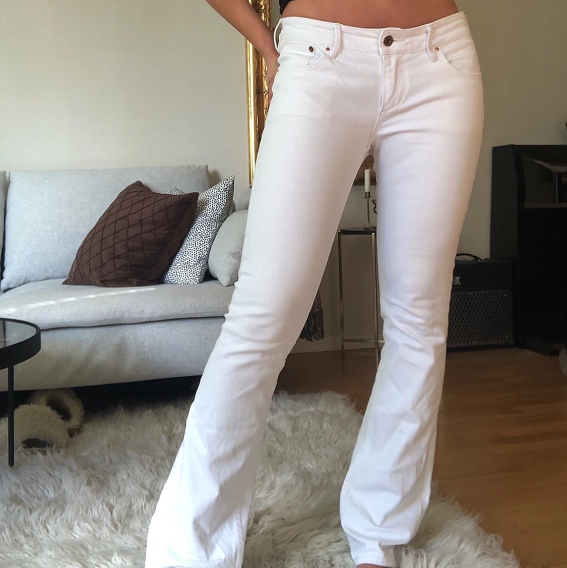 Vita utsvängda jeans som är helt intakta utan någon missfärgning eller slitningar. Jag är 170cm lång och är en S i jeans ❤️