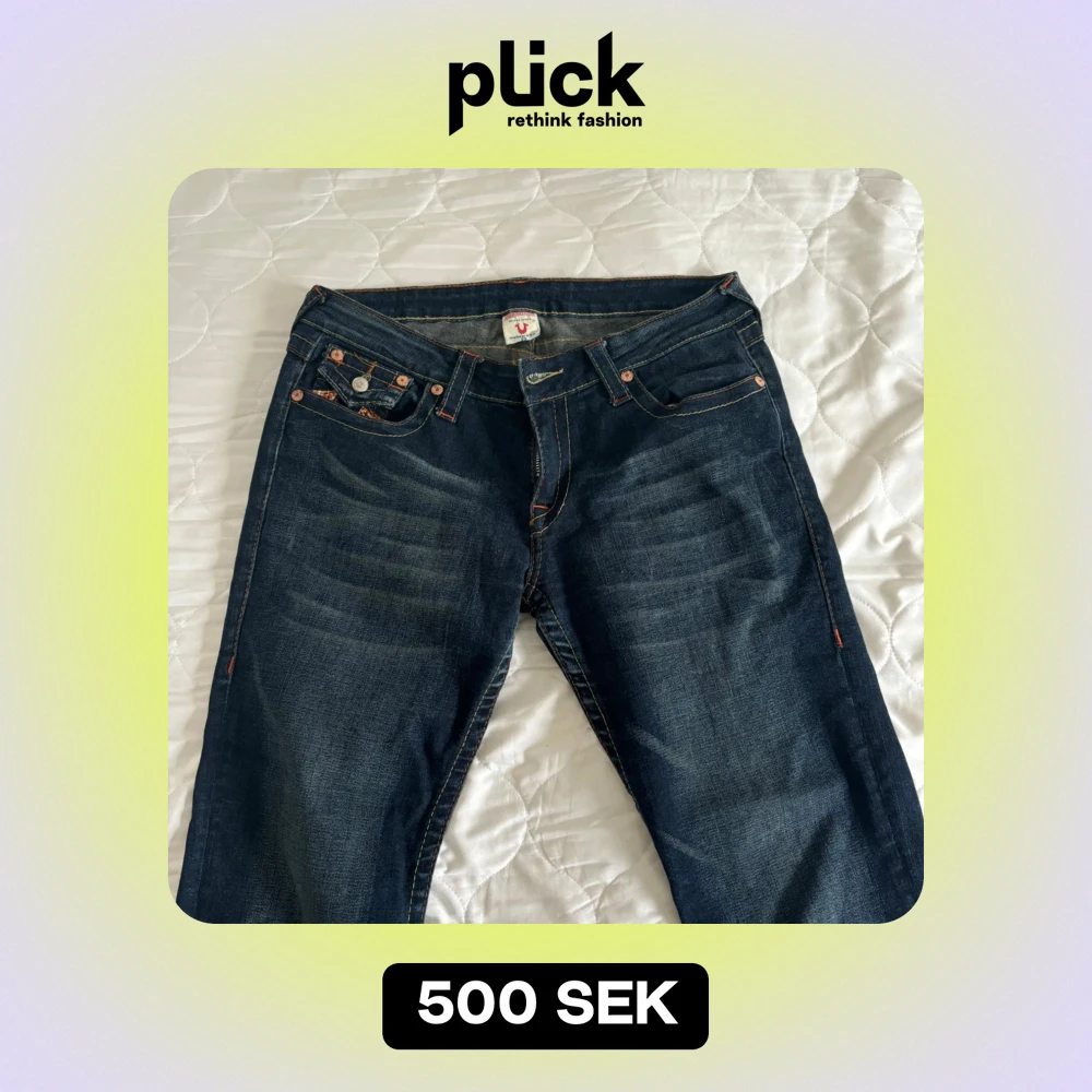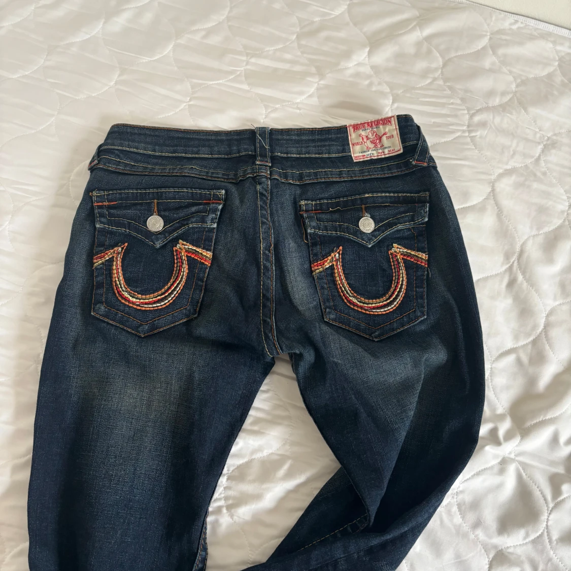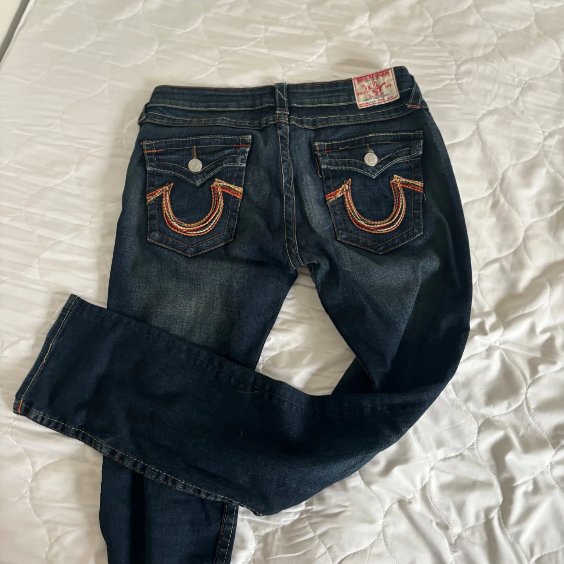 Säljer ett par snygga mörkblå jeans i bra skick. De har coola broderade detaljer på bakfickorna och en klassisk femficksdesign. Perfekta för både vardag och fest! 🕺