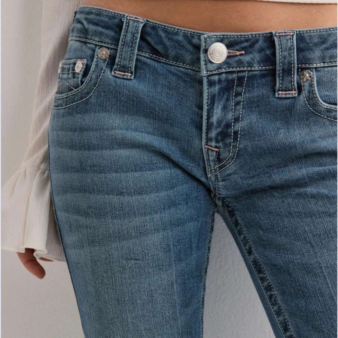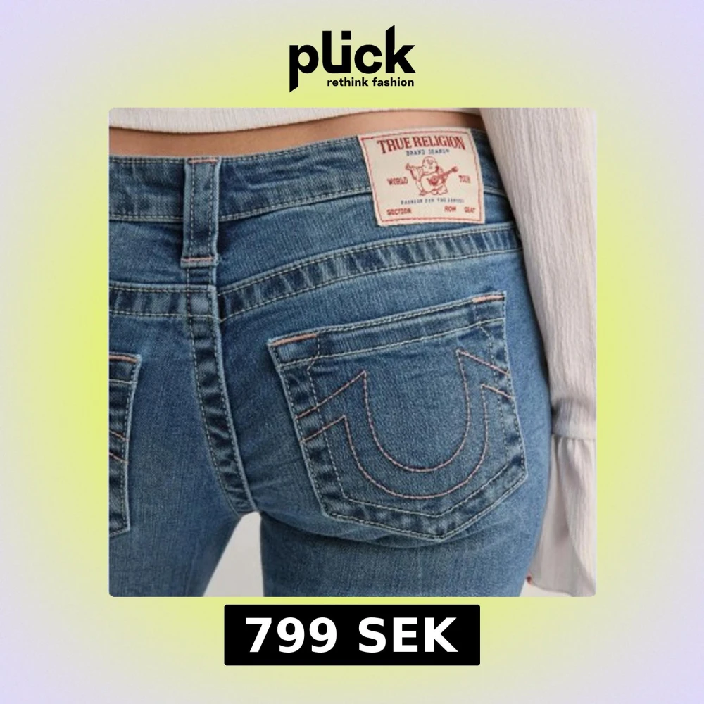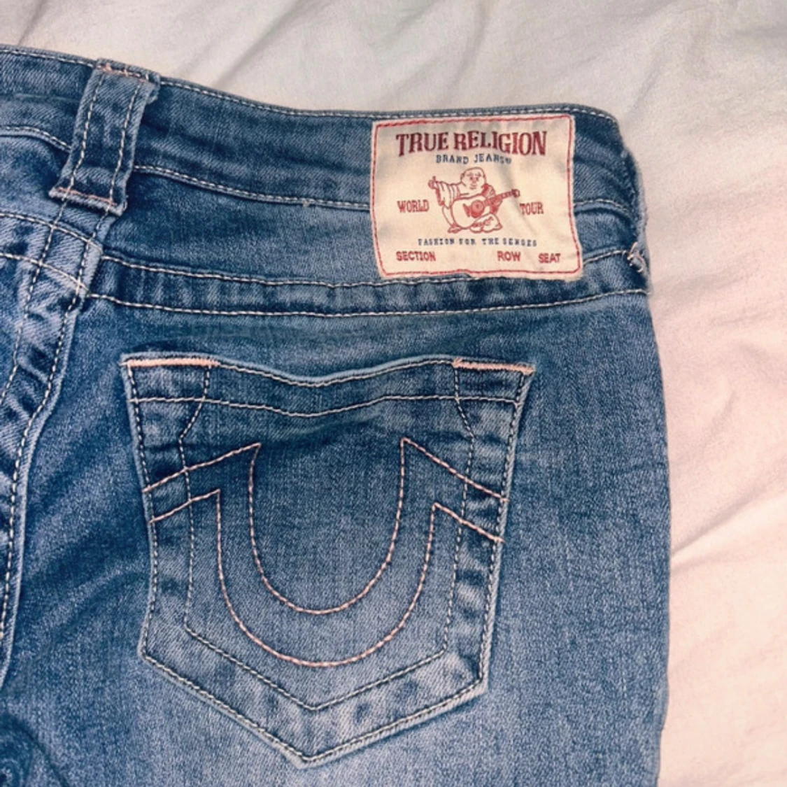Säljer ett par klassiska blå jeans från True Religion med bootcut passform. Jeansen har snygga kontrastsömmar, ikoniska bakfickor och låg midja. Storlek W26 vilket ungefär motsvarar storlek 34/38
