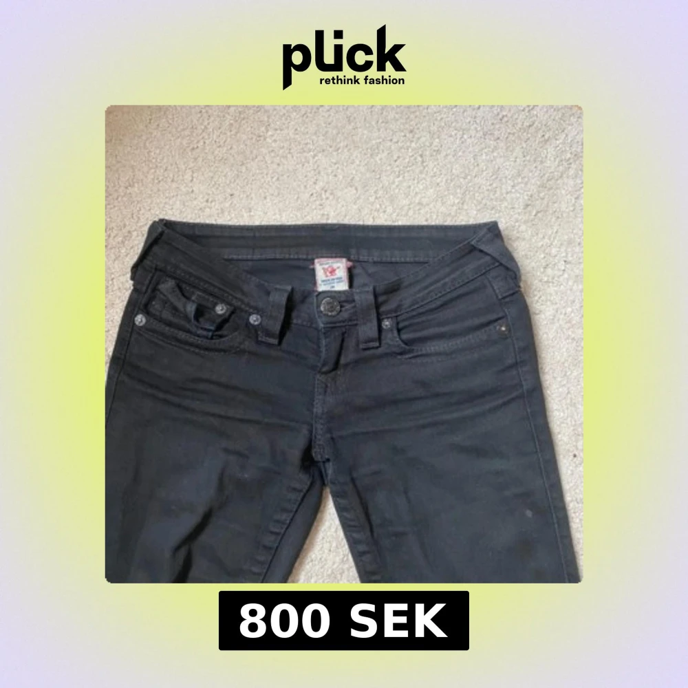 Snygga svarta vintage true religion jeans. Dom är väldigt lågmidjade och bootcut. Midja: 37 cm raköver innerben: 79 cm Pris går diskutera!