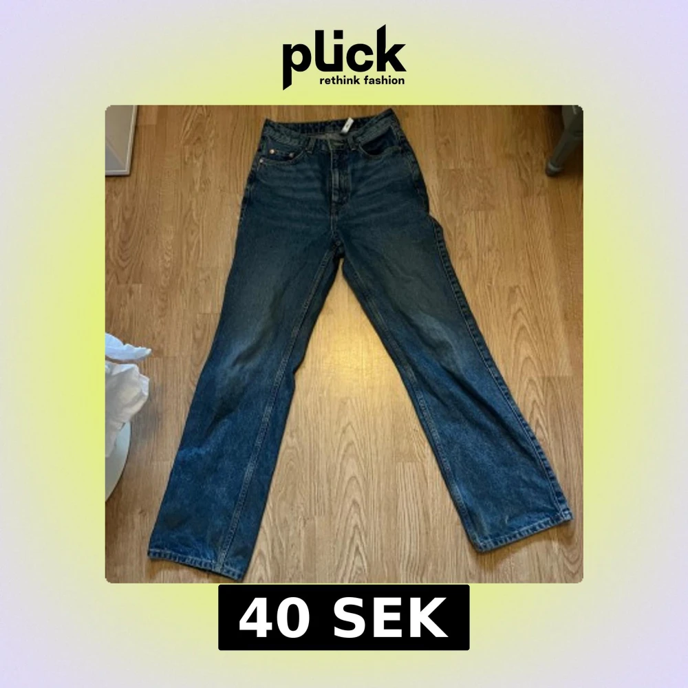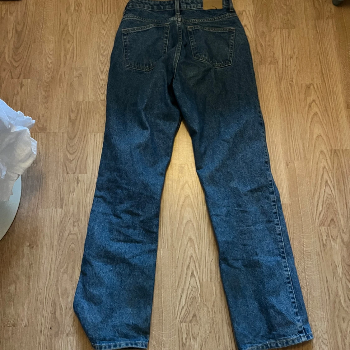 Säljer ett par klassiska blå jeansbyxor med kåg midja och rak passform. Byxorna har fem fickor och stängs med dragkedja och knapp. Perfekta för en avslappnad stil.