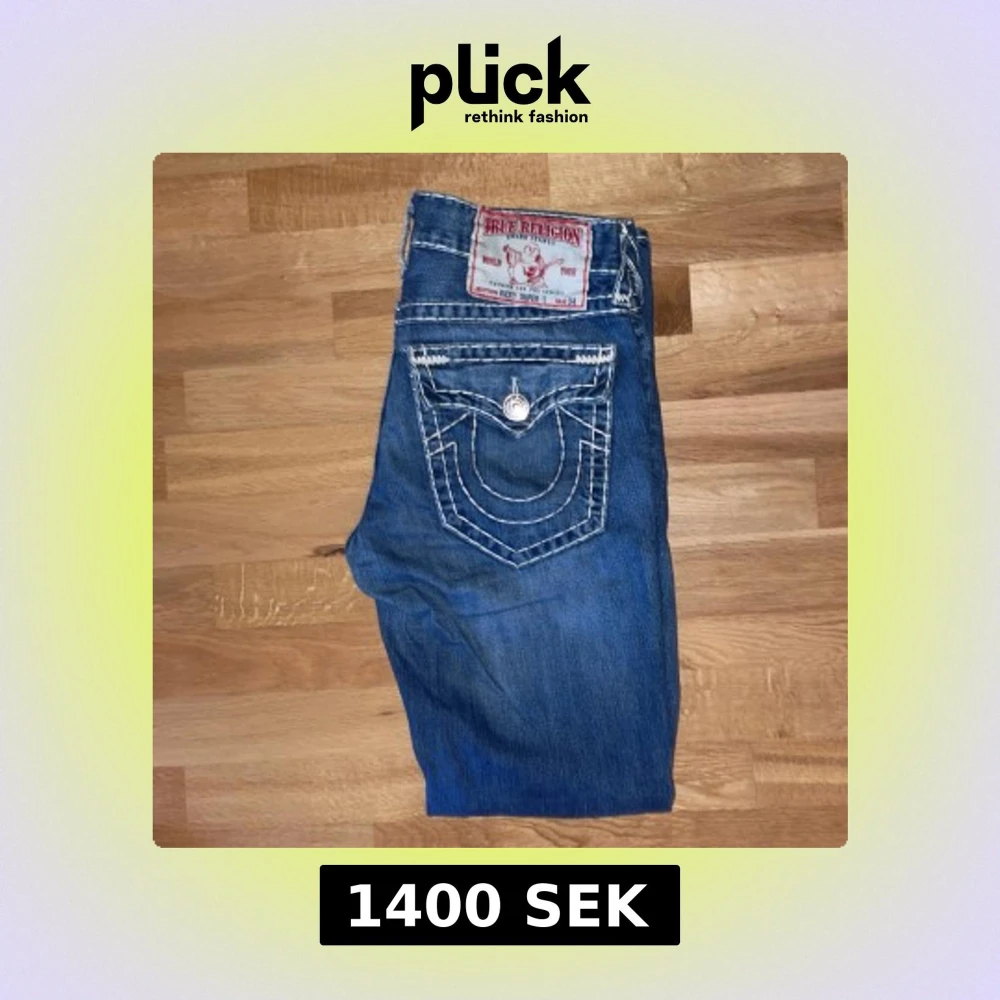 Storlek 31 i midja, mycket bra skick, bara ytterst lite heeldrag. Klassiska blåa med vita stygn.