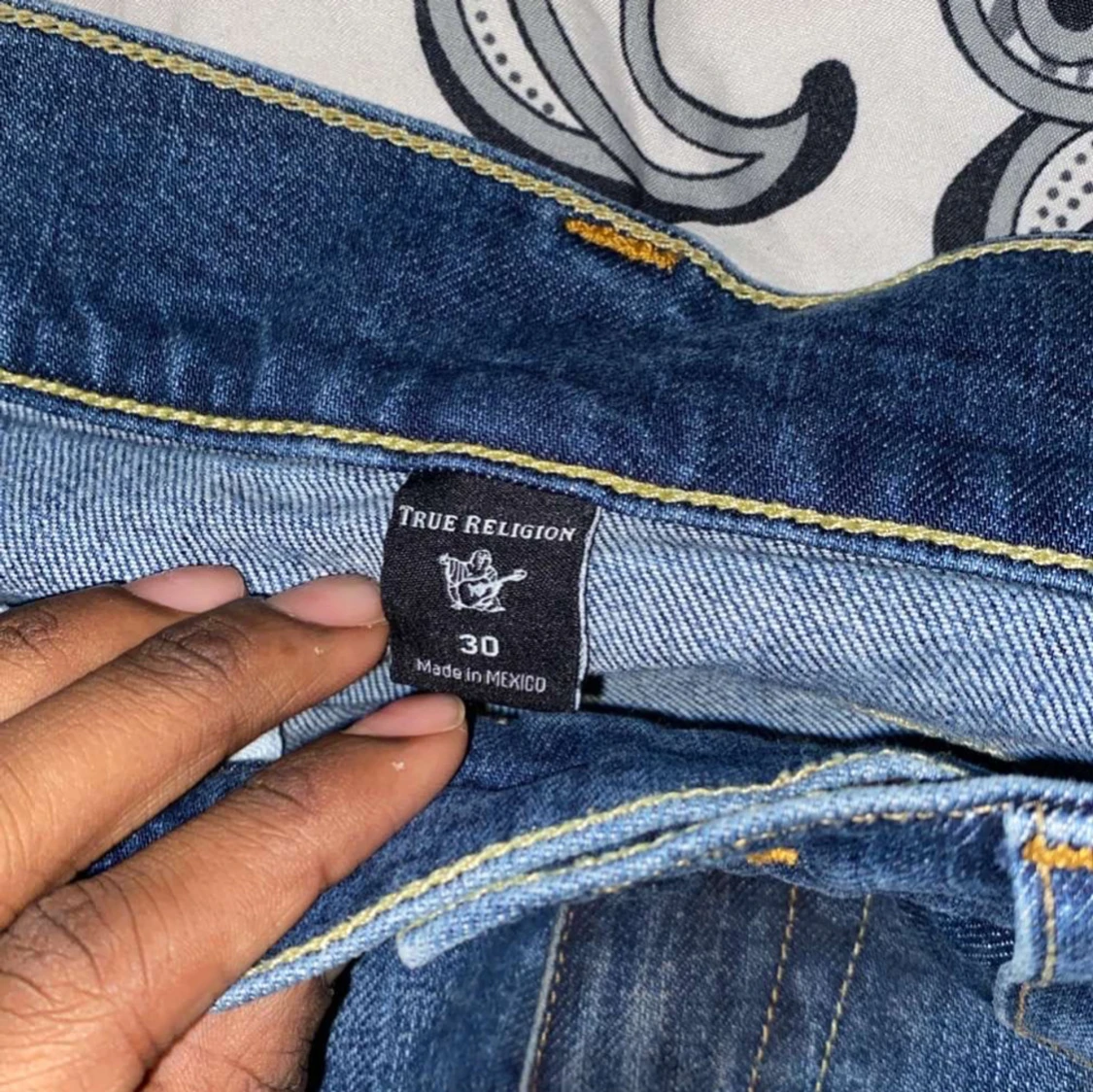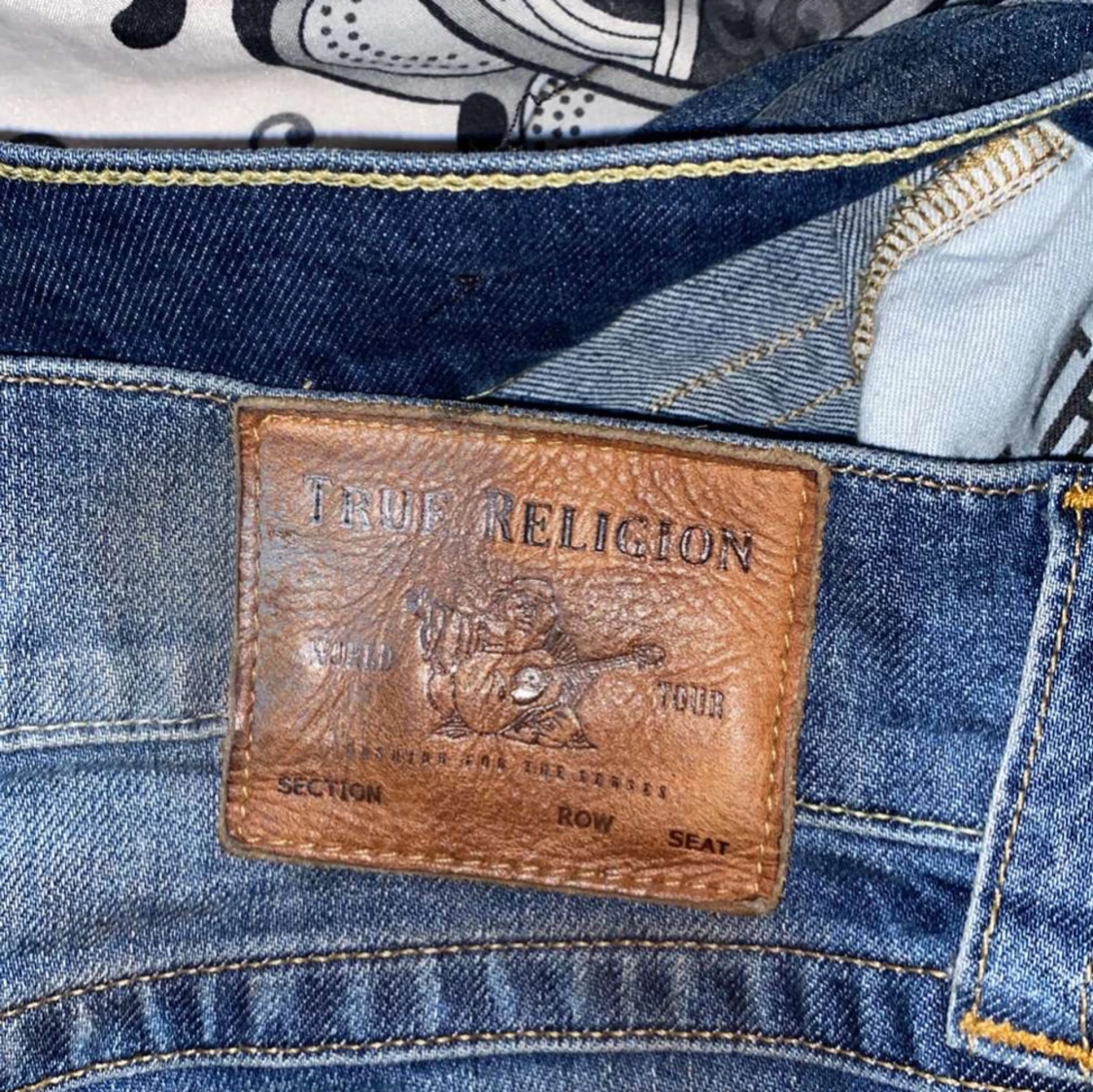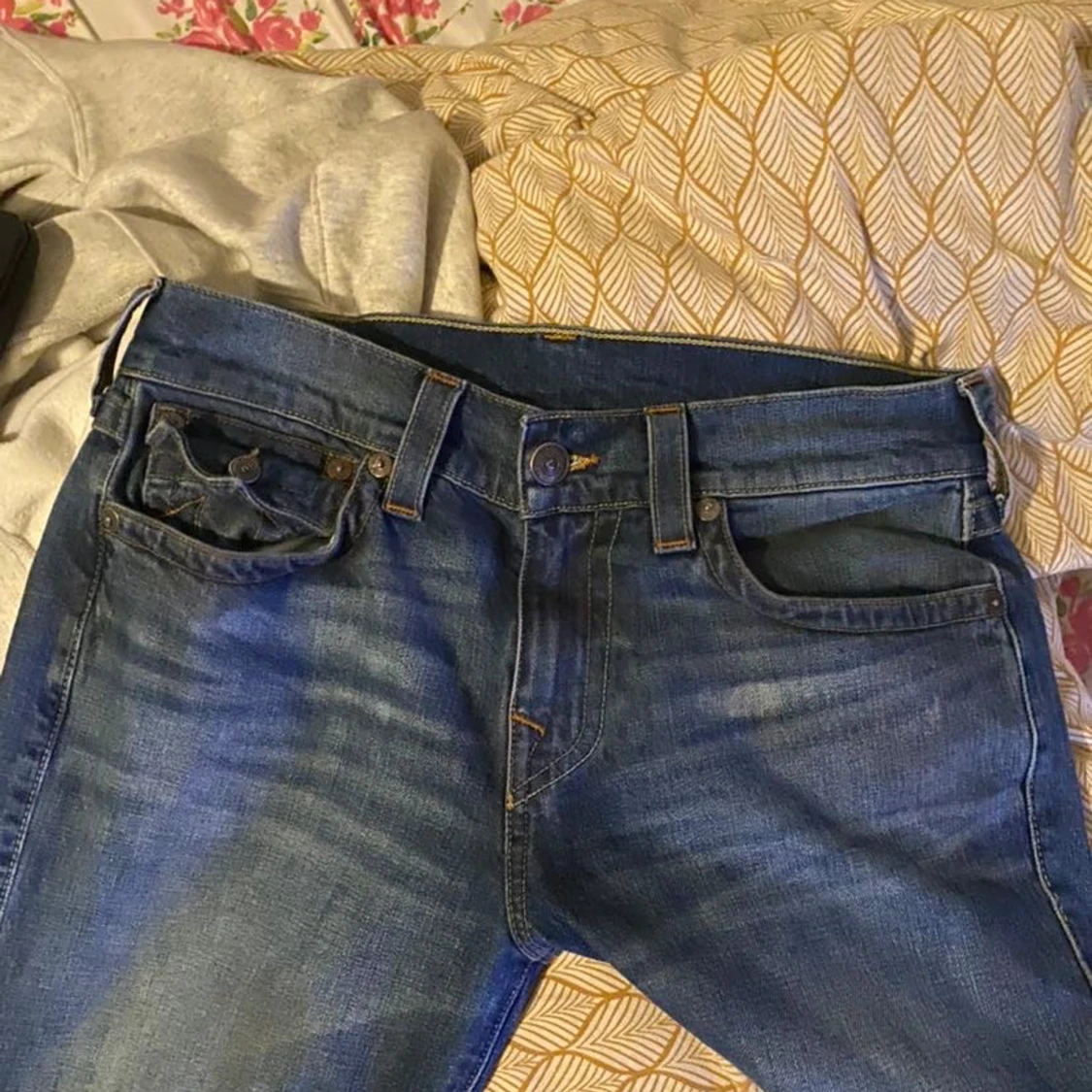 Säljer ett par klassiska blå jeans från True Religion. De har en snygg design med flared passform fickor och märkets ikoniska sömmar. köpta på en thrift store.