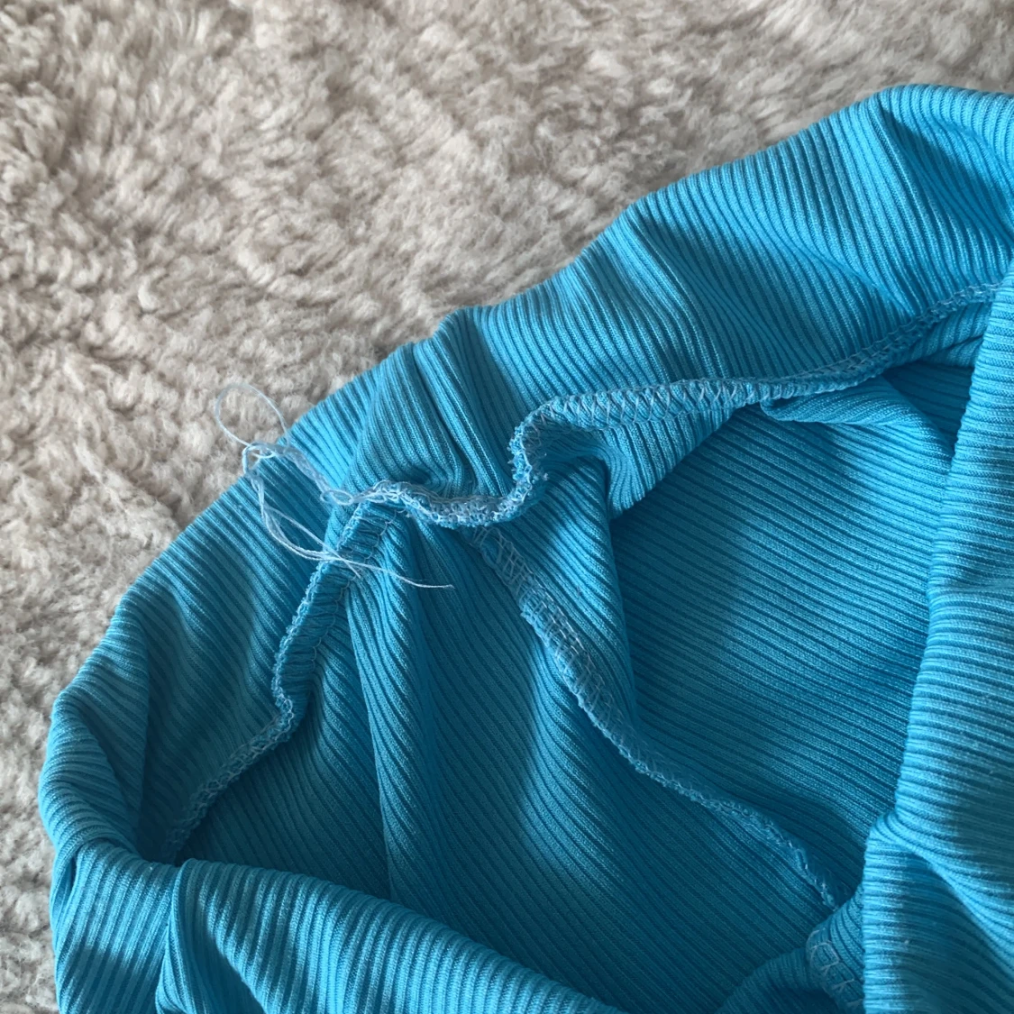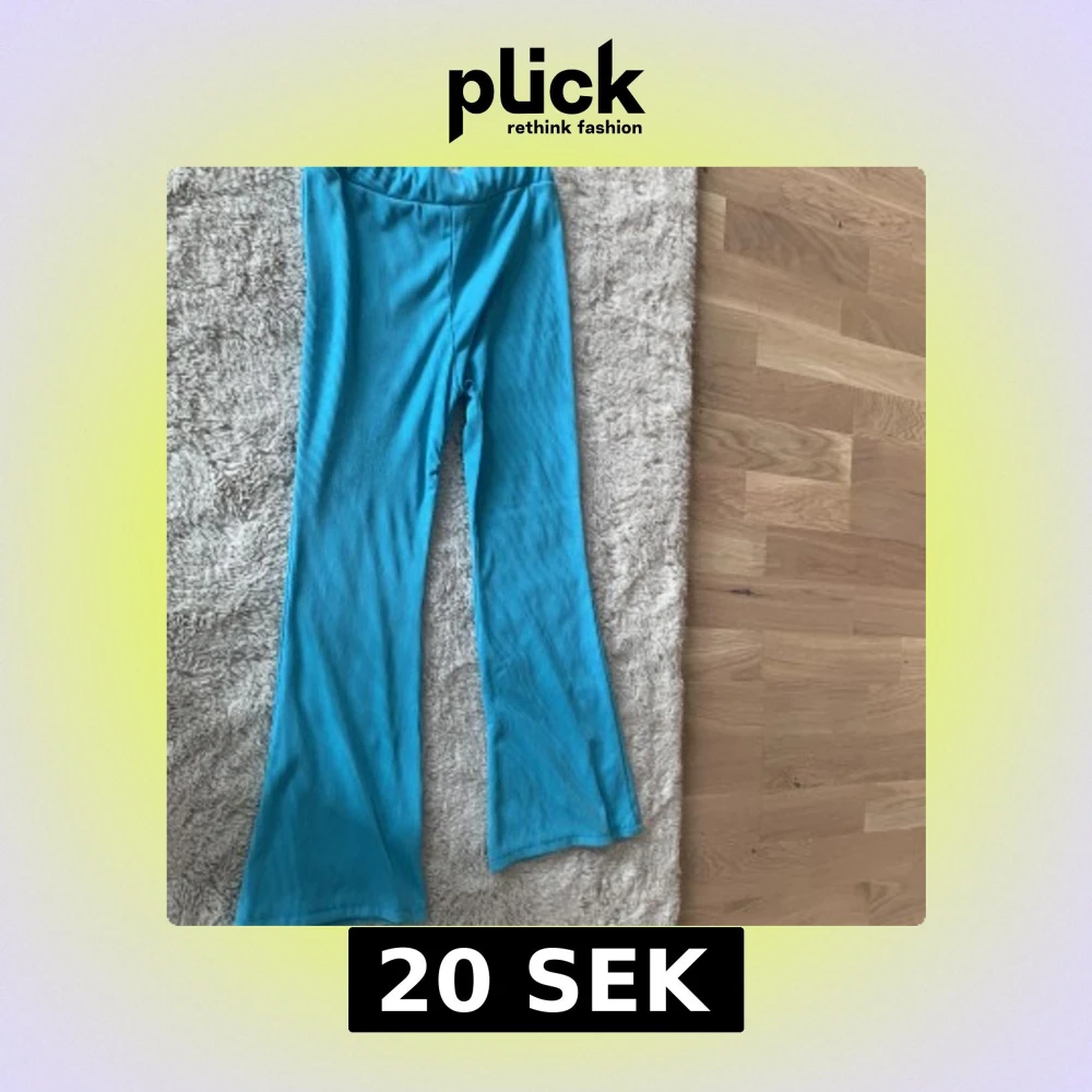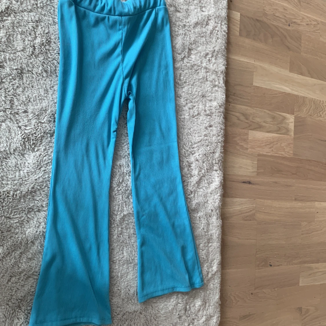 Säljer ett par turkosa ribbade byxor med bootcut-modell. Byxorna har hög midja och är gjorda i ett stretchigt, mjukt material som känns skönt mot huden. Perfekta för dig som gillar färg och vill sticka ut lite extra.