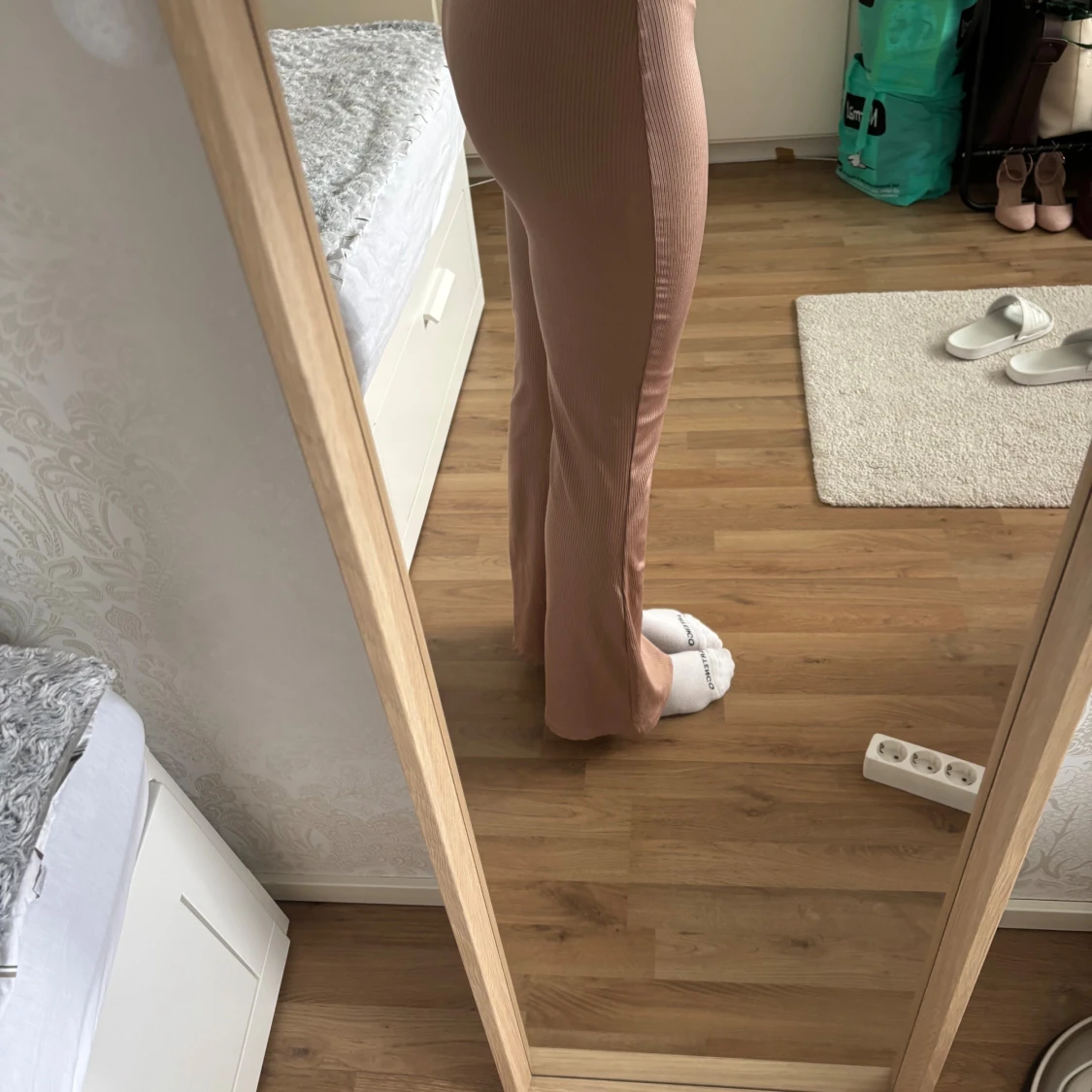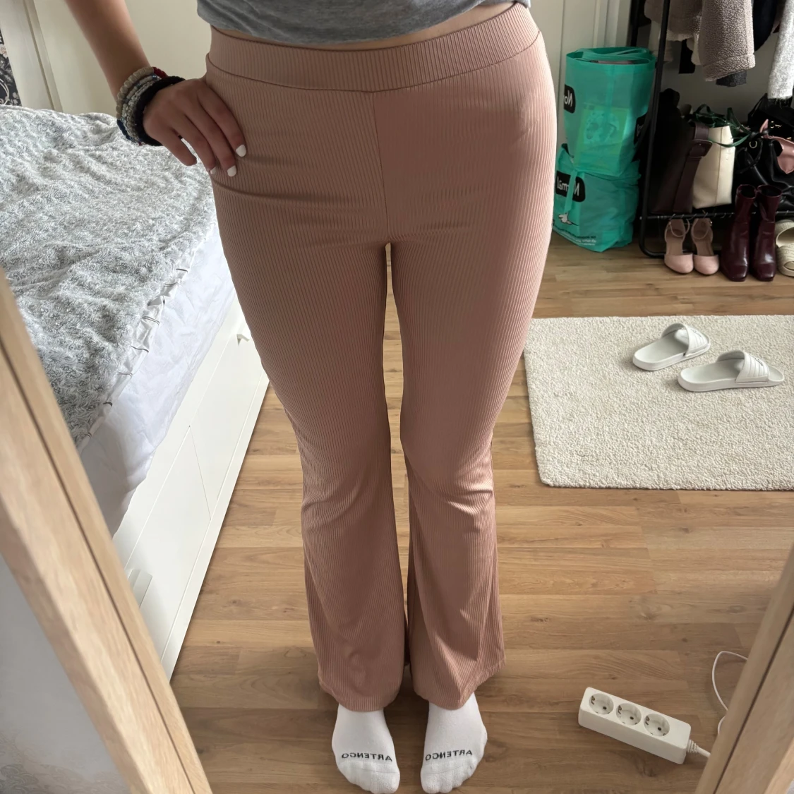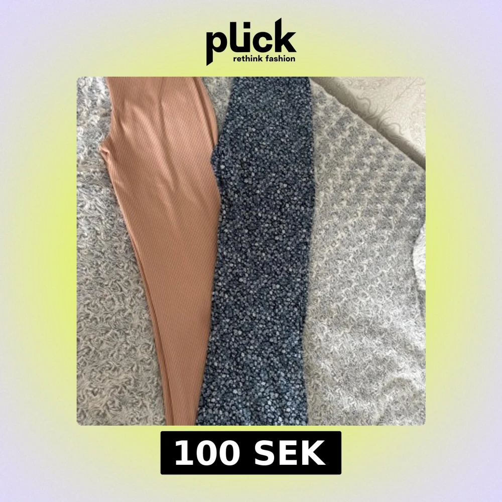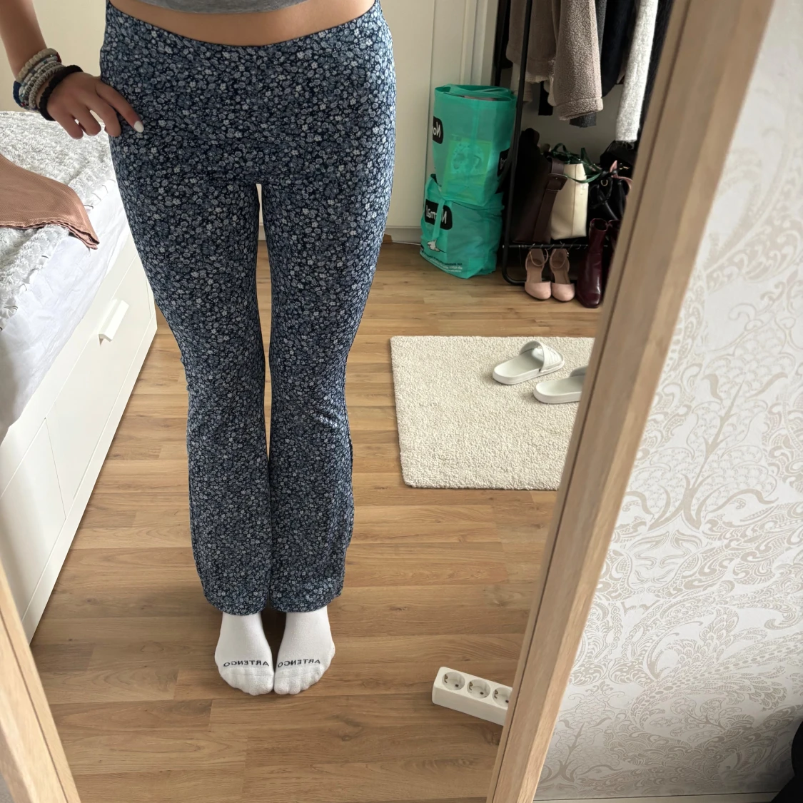 Säljer två par snygga bootcut byxor. Ena paret är blå med småblommigt mönster och stretchigt material, andra paret är ribbade i en ljusbeige ton. Båda har hög midja och sitter riktigt skönt. Perfekta för dig som gillar trendiga och bekväma byxor. Beiga paret är storlek M och blå passar storlek S
