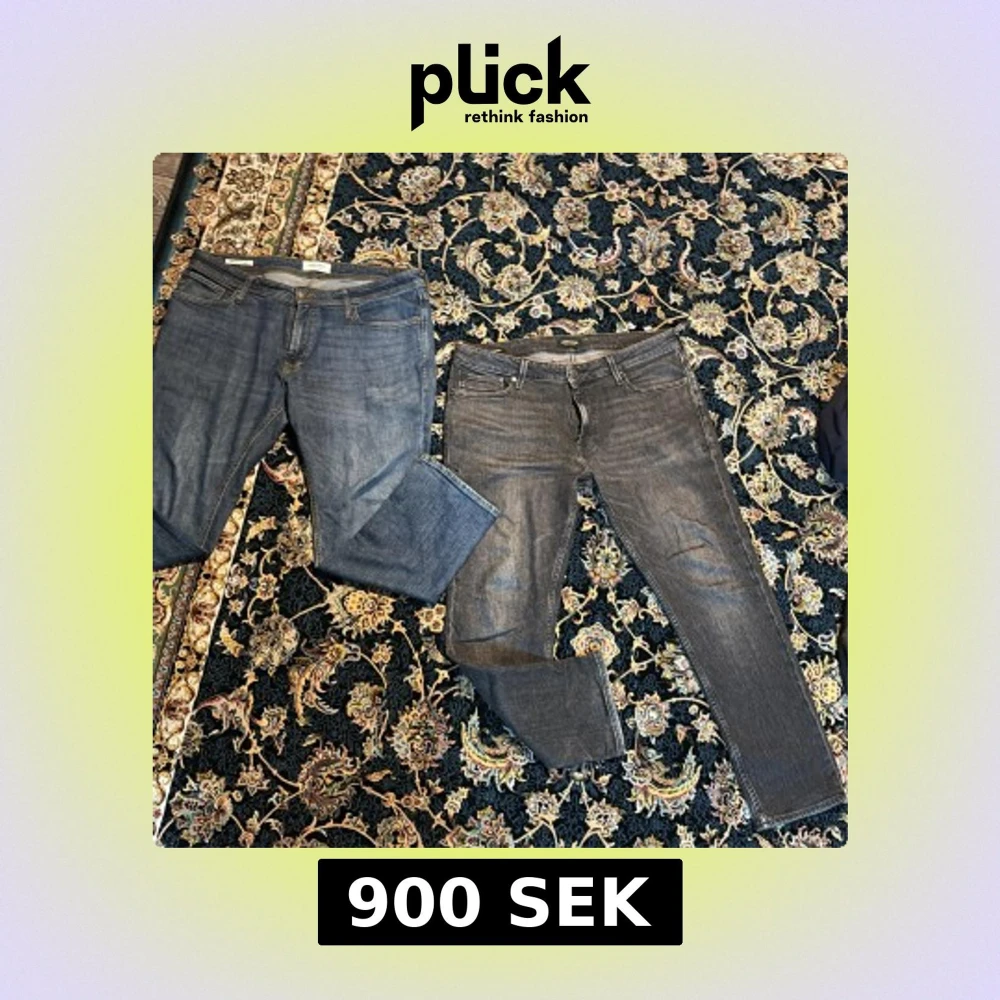 Säljer två par jeans: ett par klassiska blå Jack and Jones med rak passform och ett par gråsvarta Jack and Jones -jeans med smalare ben. Båda har femficksdesign, bälteshällor och dragkedjegylf. Perfekta för dig som gillar stilrena och tidlösa jeans.