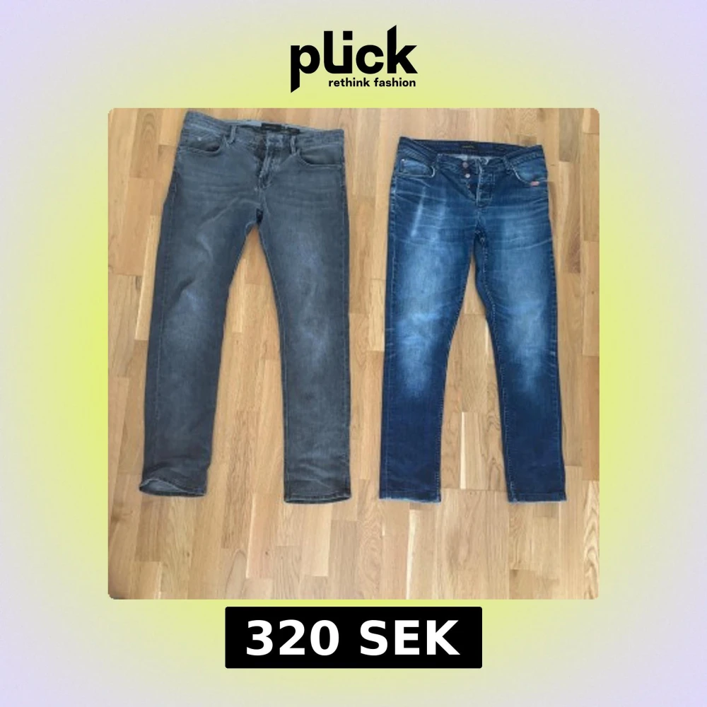Säljer två par jeans från Massimo Dutti i storlek 31. Ena paret är gråa slim fit med klassisk femficksdesign och dragkedja. Det andra paret är blå med snygg tvätt, knäppning fram och raka ben. Inga stora defekter. De gråa paren saknar lappet där bak.