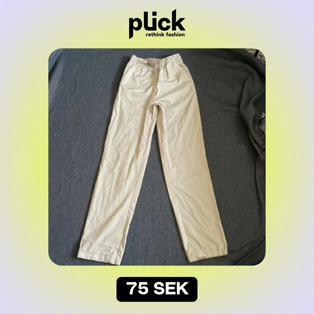 Helt nya tygbyxor i fin beige färg, väldigt bra kvalitet, fickor på sidan och dragsko i insidan vid midjan. Innreben: 77cm Yttreben: 106,5cm
