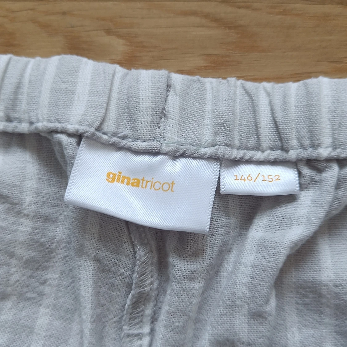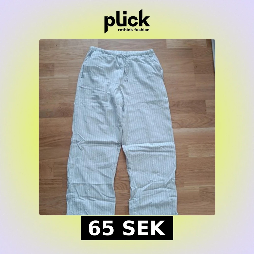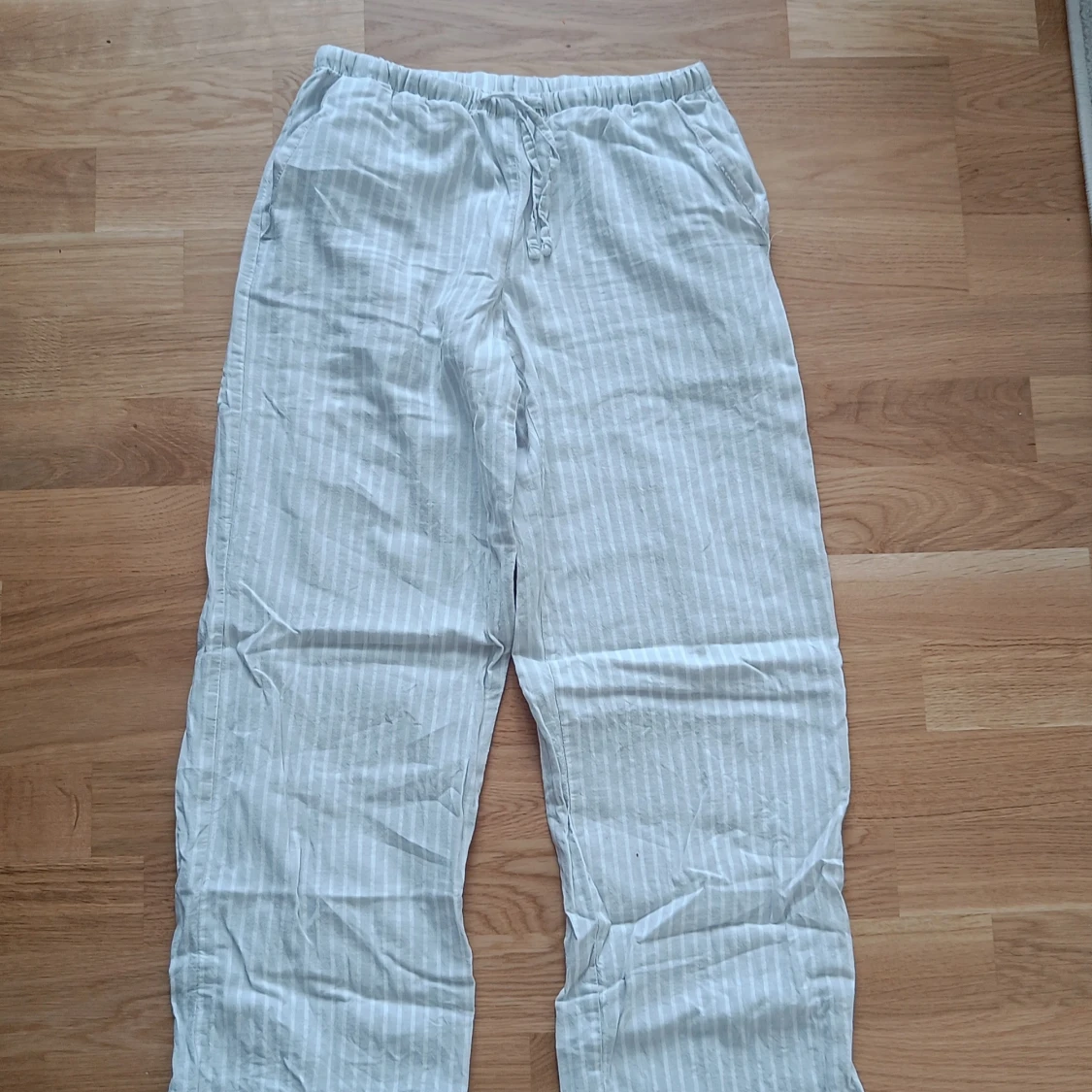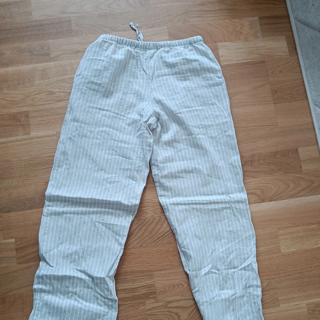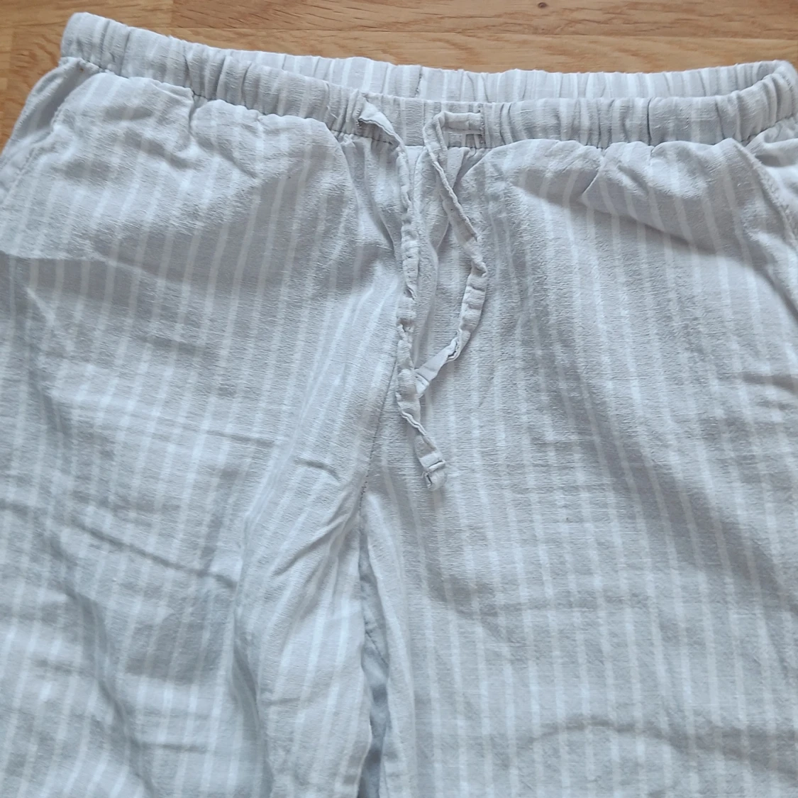 Säljer ett par bekväma och randiga byxor från Gina Tricot i storlek 146/152. Byxorna är vita med grå ränder och har en elastisk midja med snörning för extra komfort. Perfekta för sommaren!