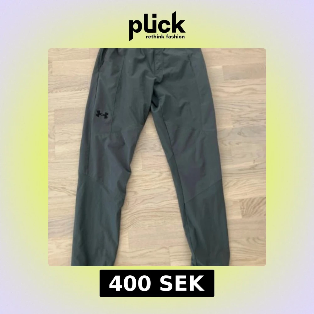 Säljer ett par mörkgrrå träningsbyxor från Under Armour med elastisk midja och snörning. Byxorna har en sportig look med logga på låret och är tillverkade i ett lätt syntetmaterial som passar perfekt för träning.