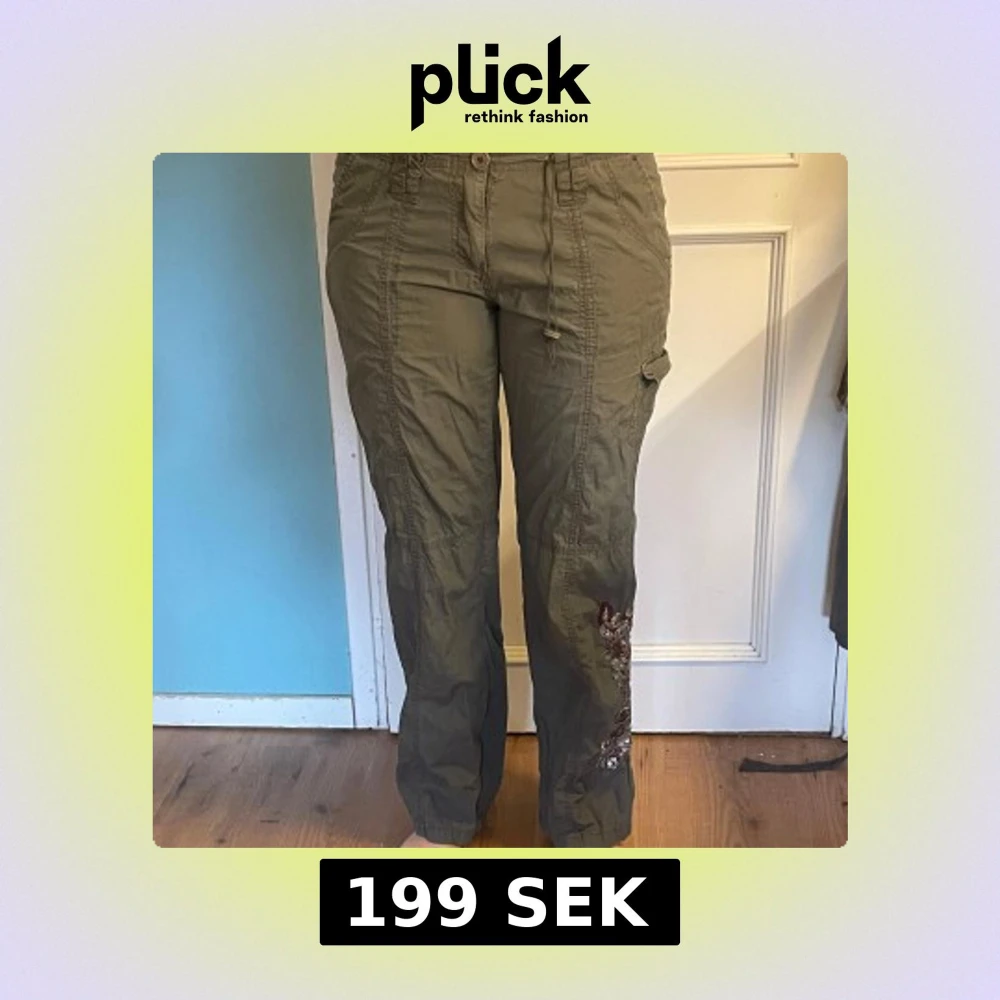 Snygga olivgröna cargopants med broderade blommor och paljetter på ena benet. Byxorna har flera fickor, snörning i midjan och raka ben. Perfekta för dig som gillar en avslappnad men ändå unik stil. Midjemått ca 42cm rakt över, ca 77 cm innerbennslängd