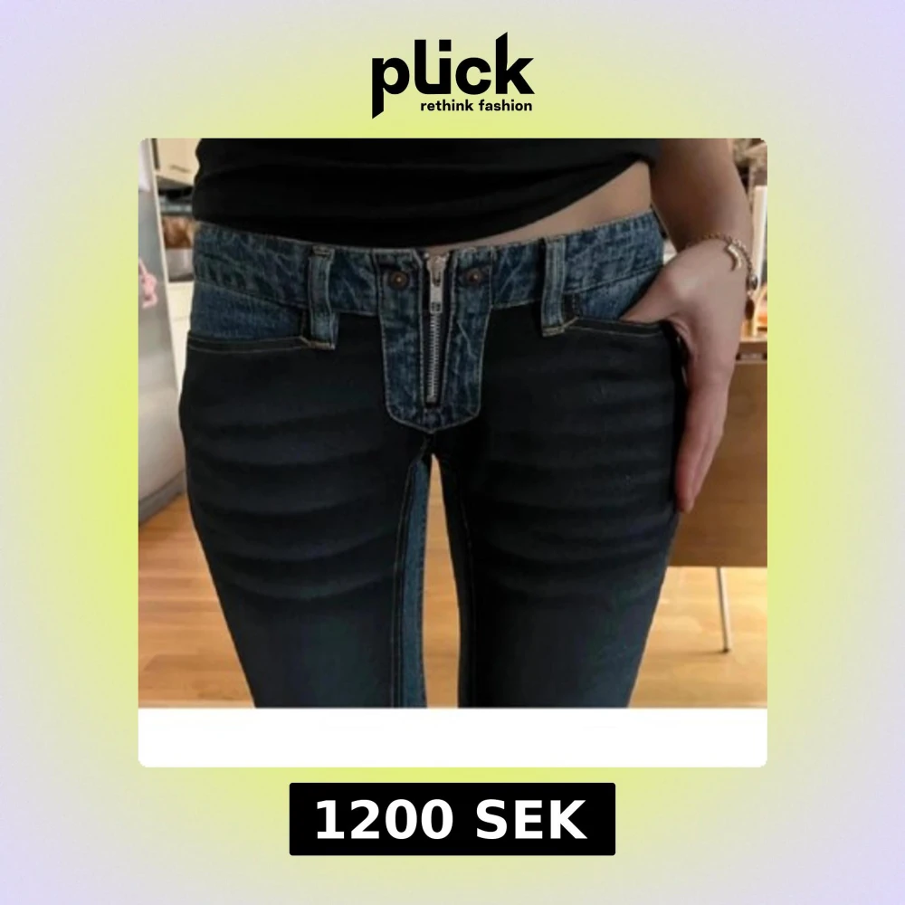 Säljer ett par blå jeans med låg midja och markerad dragkedja framtill. Byxorna har en annorlunda design med bred linning och dubbla knappar. Modellen är bootcut och materialet är klassisk denim.