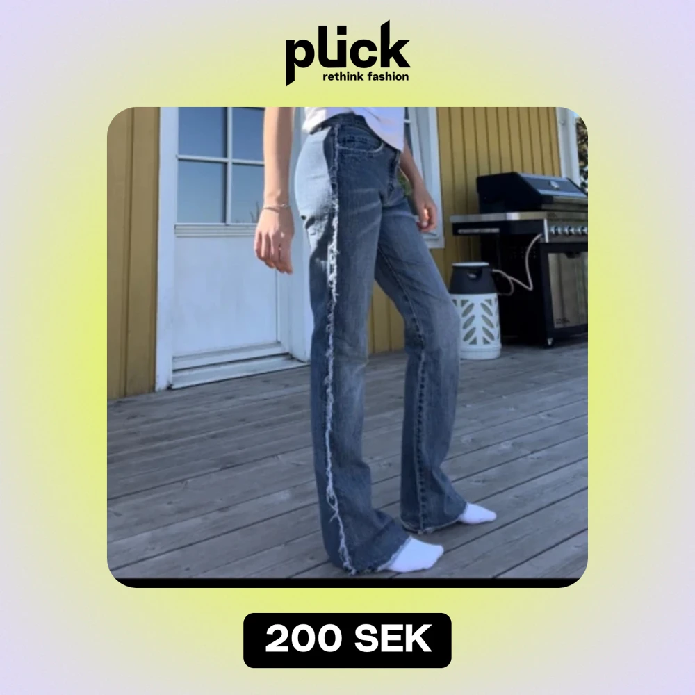 VĂ€ldigt unika jeans med fransar pĂ„ sidorna MidjemĂ„tt tvĂ€rsöver: 38cm InerbenslĂ€ngd: 80cmđ Kolla gĂ€rna in min profil, sĂ€ljer flera jeans för ett billigt pris đ„°