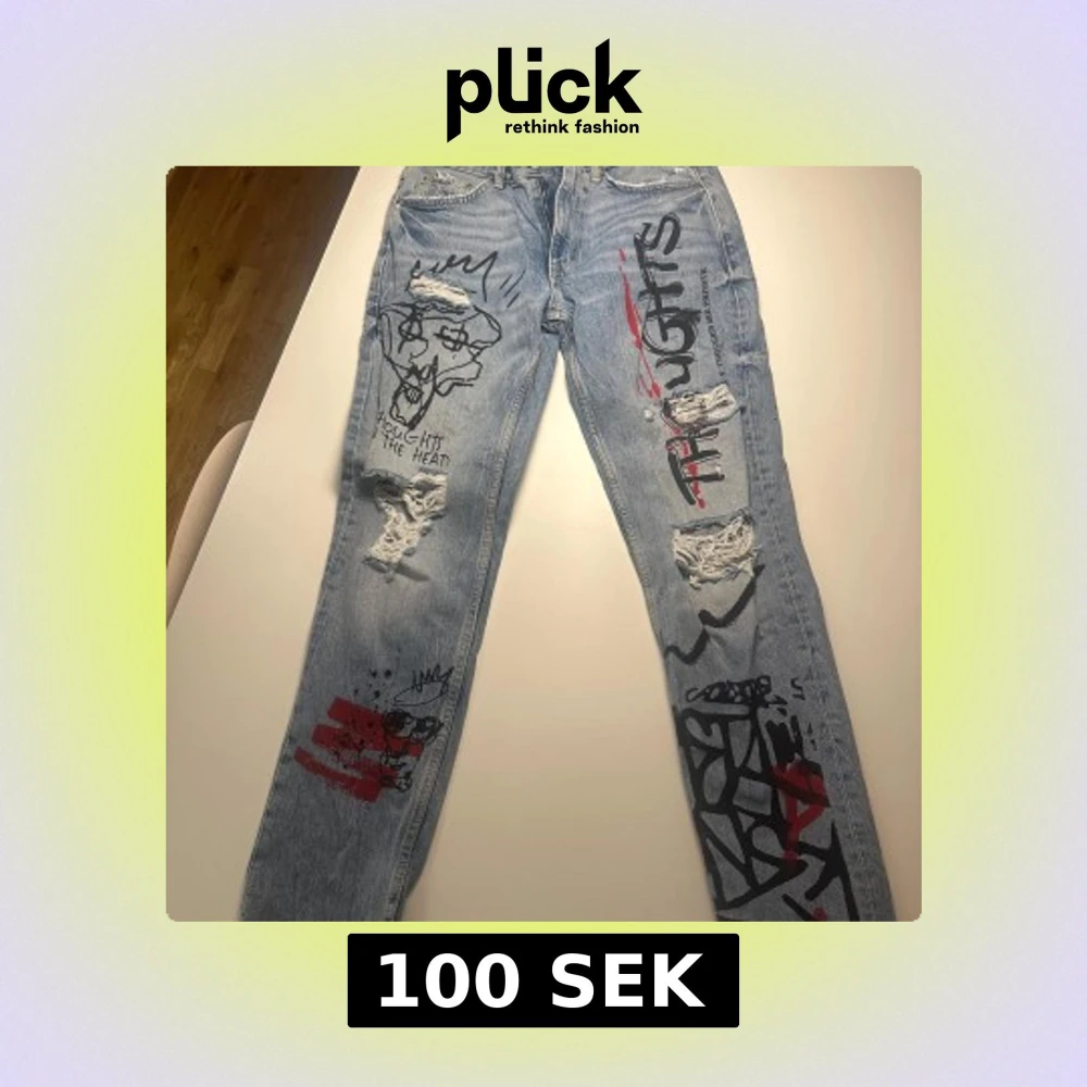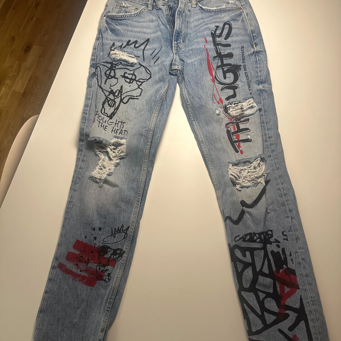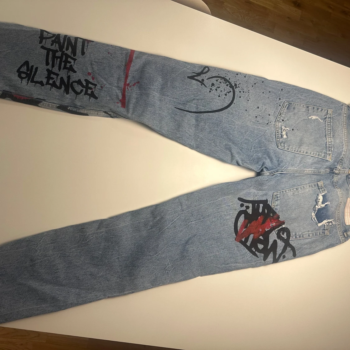Snygga ljusblå jeans med unik graffiti-design och slitna detaljer. Byxorna har coola tryck i svart och rött, vilket ger dem en edgy look. Perfekta för dig som vill sticka ut med din stil.