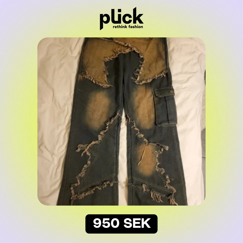Säljer ett par riktigt coola jeans med en unik design. De är mörkblå med slitna detaljer och fransar över hela byxorna. Det finns också en praktisk cargoficka på sidan. Perfekta för dig som vill sticka ut med en edgy stil!