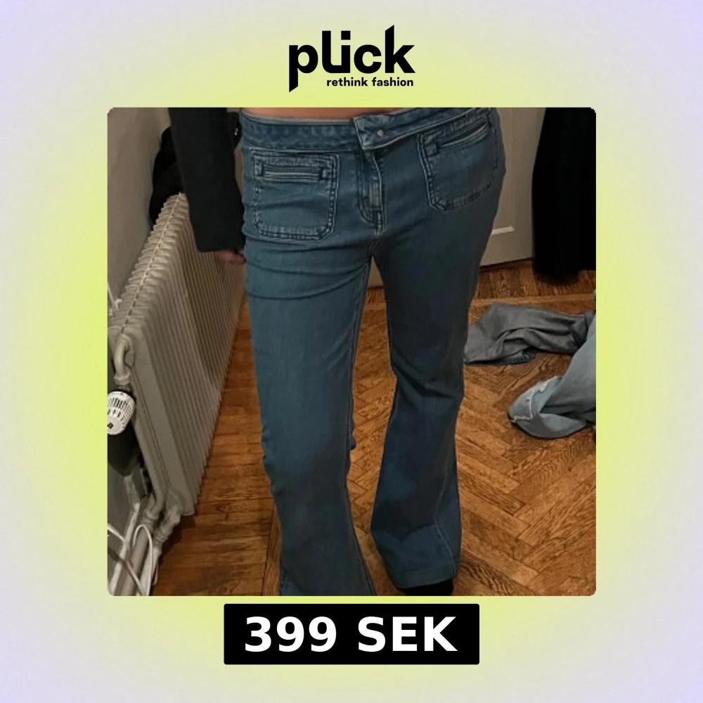 Snygga blå bootcut jeans med klassiska fickor. Köpta för 1899kr från Dante6. Storlek M. Midjemått 44cm tvärt över. Innebenslängden är 77cm 💕