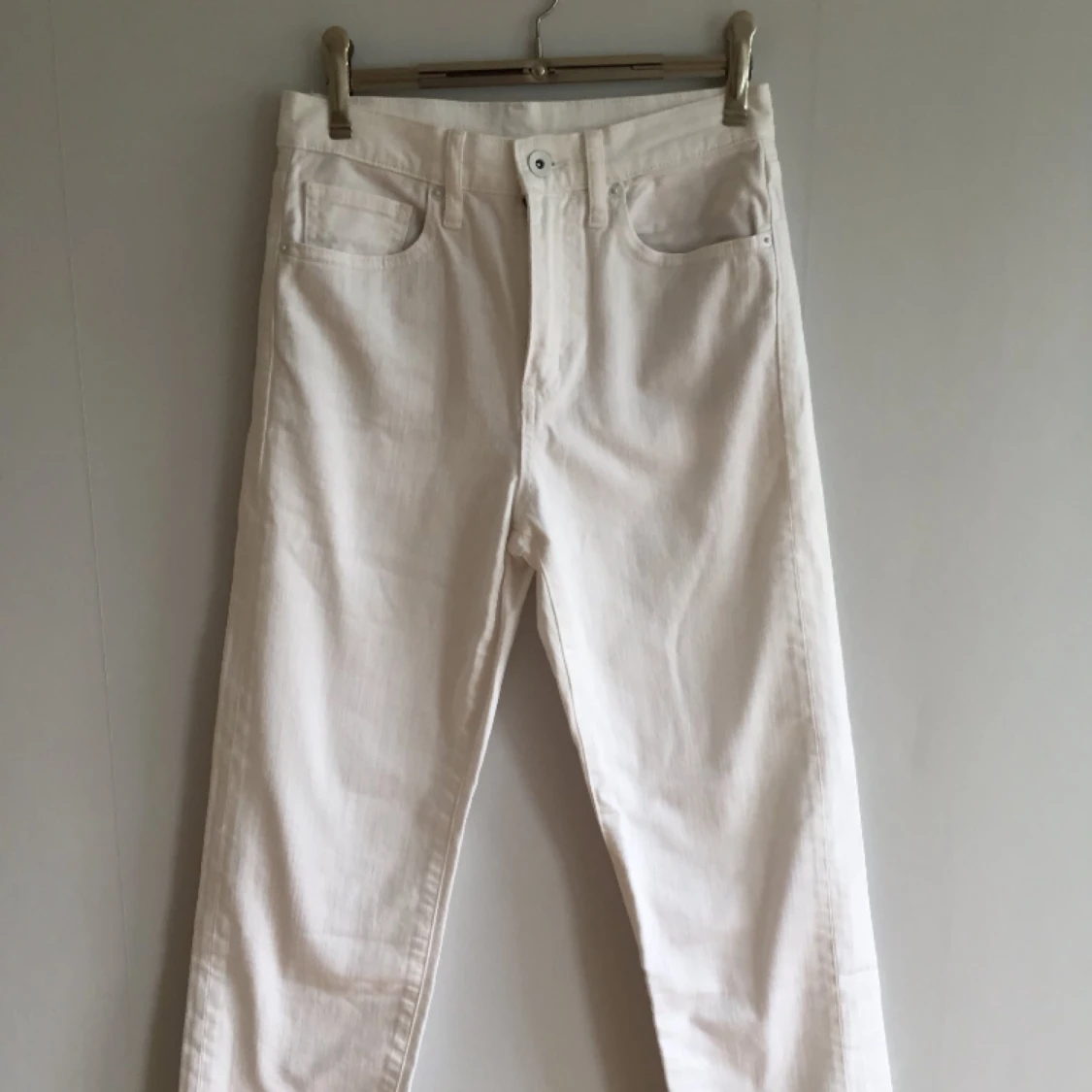 Trendiga raka vita jeans från märket Uniqlo. 24 inch/61 cm i midjan. Skulle uppskatta dem till en europeisk strl XS. Köpta utomlands, säljes då de tyvärr är för små för mig. Aldrig använda.